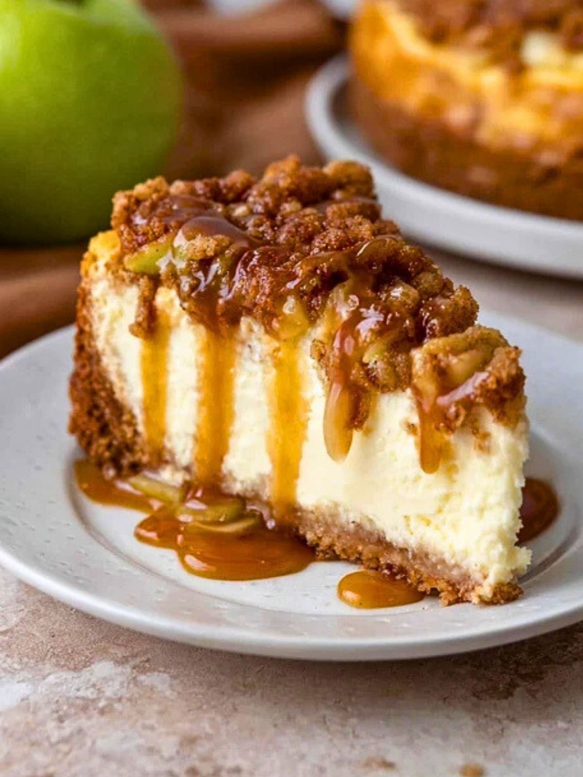 Imagine sinking your fork through a buttery graham cracker crust, velvety smooth cheesecake, tender cinnamon apples, and a crunchy brown sugar streusel—all topped off with a warm drizzle of caramel. It’s the ultimate comfort dessert that works year-round but shines brightest during apple season.