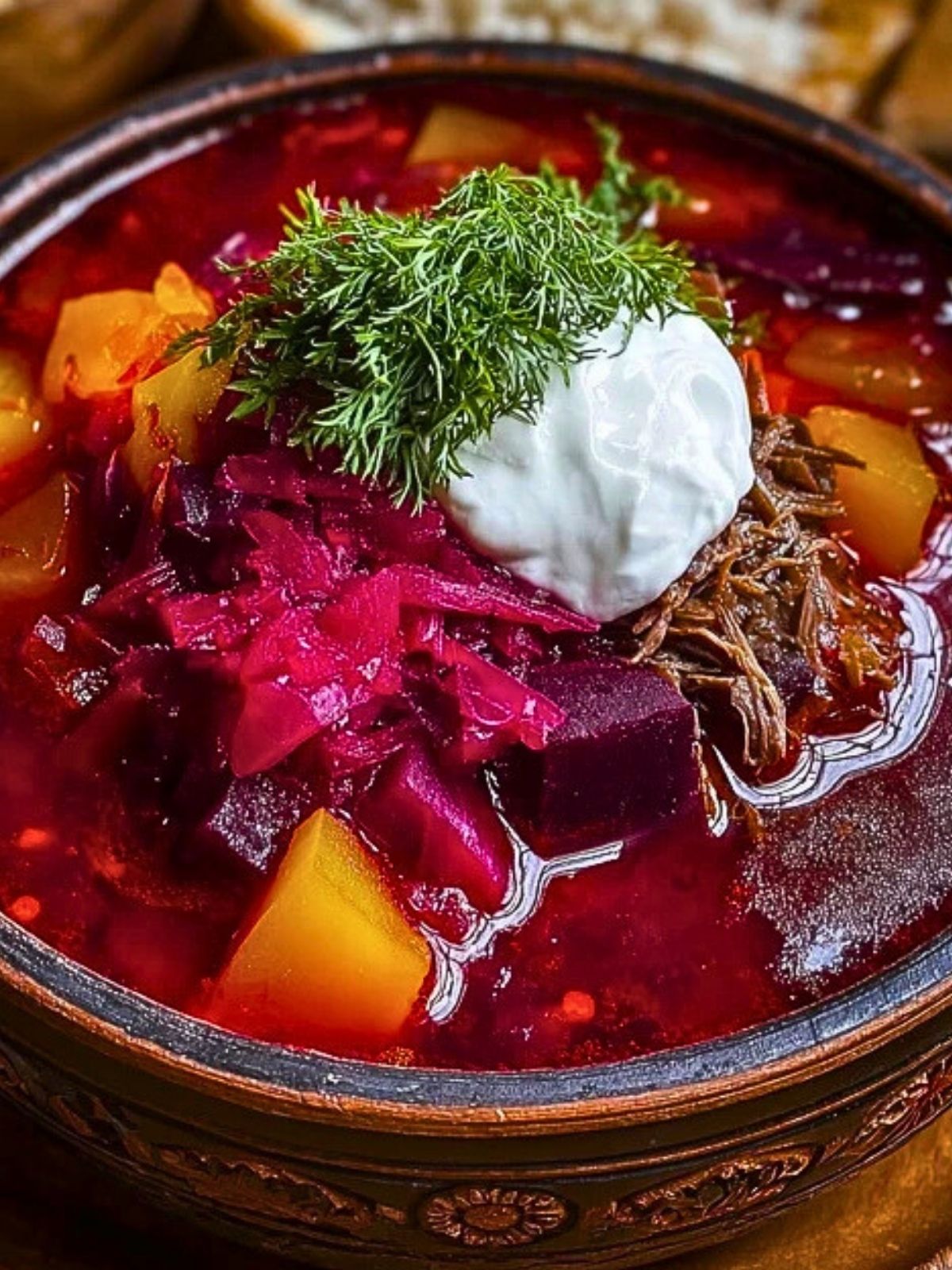 With a broth tinted vibrantly by beets and layered with tender vegetables, melt-in-your-mouth beef, and a creamy dollop of sour cream, this soup does more than warm you up. It tells a story. Whether you’re diving into it for the first time or revisiting a family classic, this recipe delivers both comfort and culinary depth in every bite.