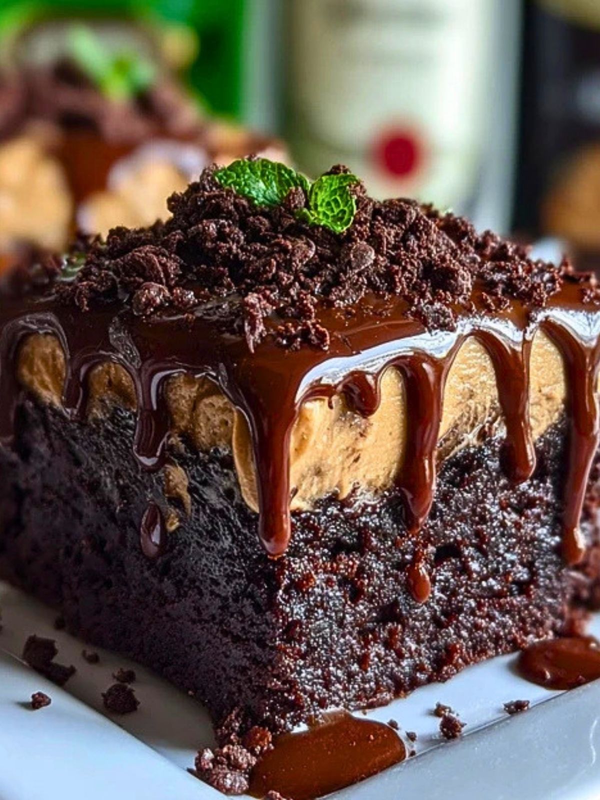 Pour the ganache over the cooled brownies, spreading it edge to edge. Refrigerate for at least 1 hour to set. Garnish with crushed chocolate cookies or mint leaves before serving, if desired.