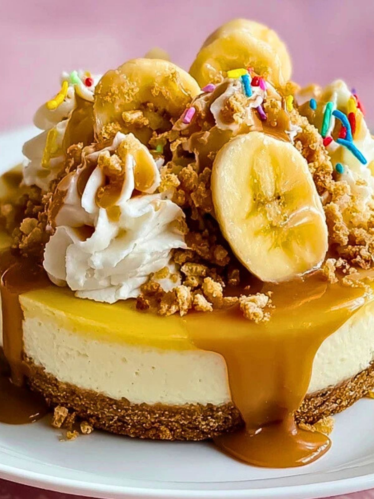 Top with whipped cream swirls, extra banana slices, a drizzle of caramel sauce, and sprinkles or crushed wafers if desired. Slice and enjoy!