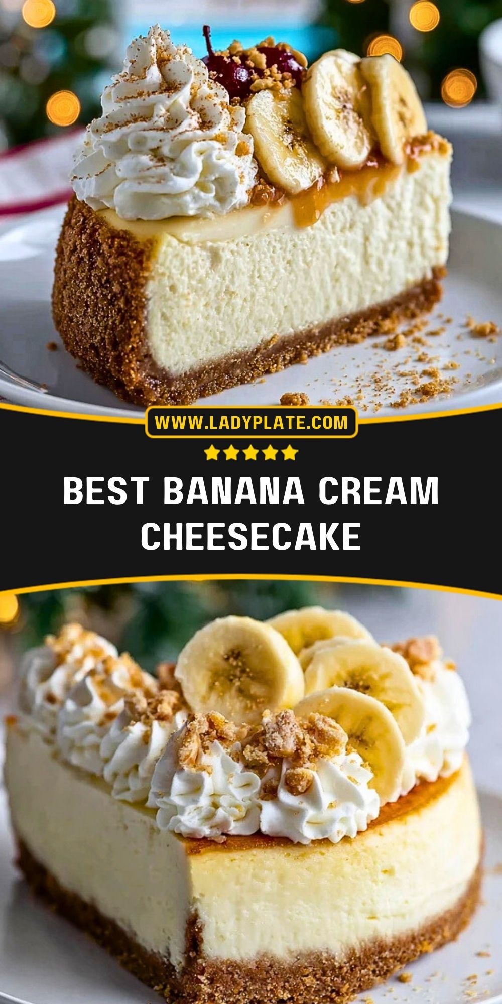 When you make this Banana Cream Cheesecake, let me know how it goes! Did you go heavy on the whipped cream? Add caramel or a special twist? Leave a comment below or tag me with your version. And for even more decadent ideas, check out my Pinterest at LadyPlate.