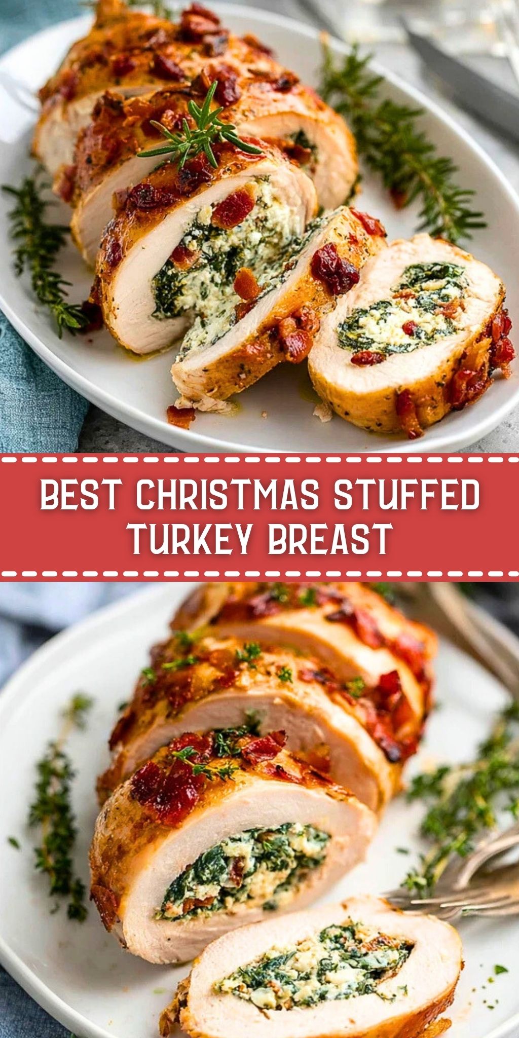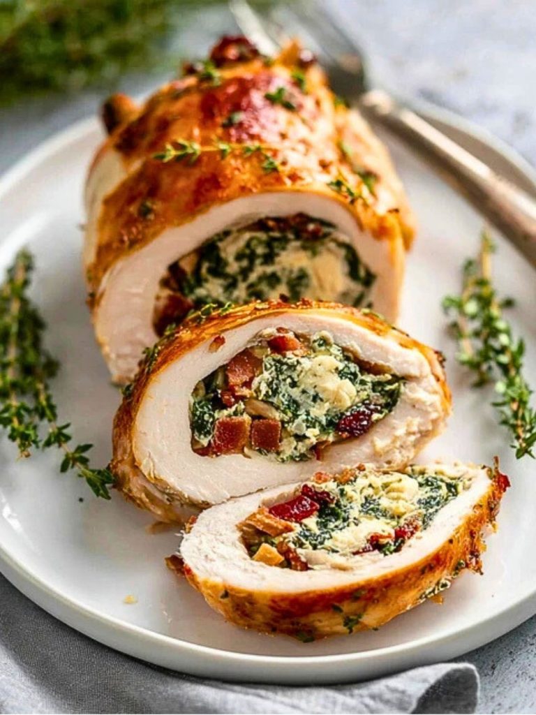 A festive and elegant main dish, this stuffed turkey breast is rolled with pancetta, spinach, sun-dried tomatoes, and herbed cheese. Perfect for Christmas dinner, it slices beautifully and tastes as good as it looks. Juicy, savory, and full of color—this roast makes an unforgettable holiday centerpiece.