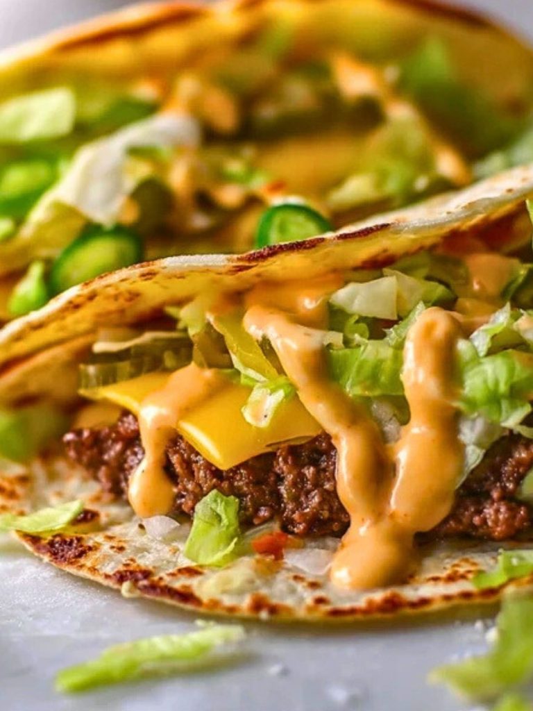 Each bite offers the familiar tang of pickles, the richness of American cheese, crunchy lettuce, and of course, that unmistakable creamy Big Mac-style sauce. All wrapped in a lightly toasted tortilla, these tacos are a mouthwatering twist for burger night or your next gathering.