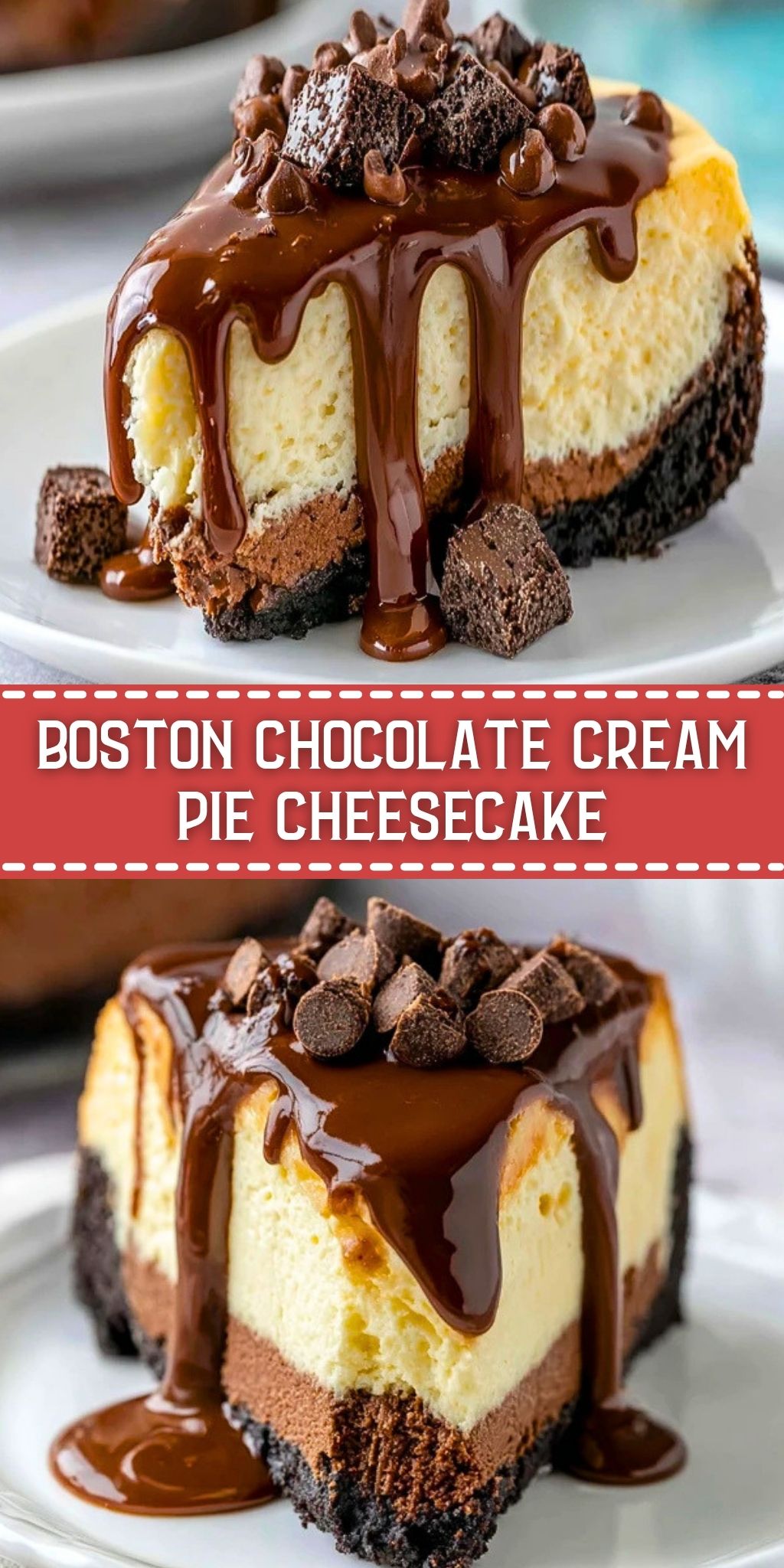 Rich, creamy, and layered to perfection, this Boston Chocolate Cream Pie Cheesecake blends everything you crave in a dessert—crunchy Oreo crust, smooth chocolate and vanilla cheesecake layers, and a glossy ganache topped with chocolate chips. Whether you’re looking for a show-stopping dessert, easy recipe for celebrations, or just a new indulgent food idea to try, this cheesecake covers it all. It’s a must-save for your collection of easy dinner desserts, quick breakfast sweets, or healthy snack alternatives (well…a little indulgent never hurt!).