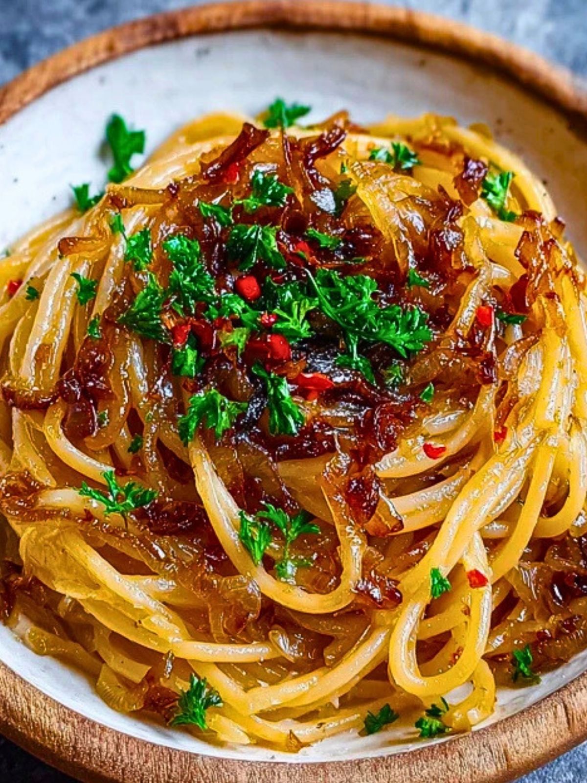 This pasta is best served immediately while warm and glossy, straight from the pan. The chilli oil is at its peak aroma when freshly drizzled, and the caramelized onions are melt-in-your-mouth tender. Garnish with more fresh parsley or even a grating of parmesan if desired.