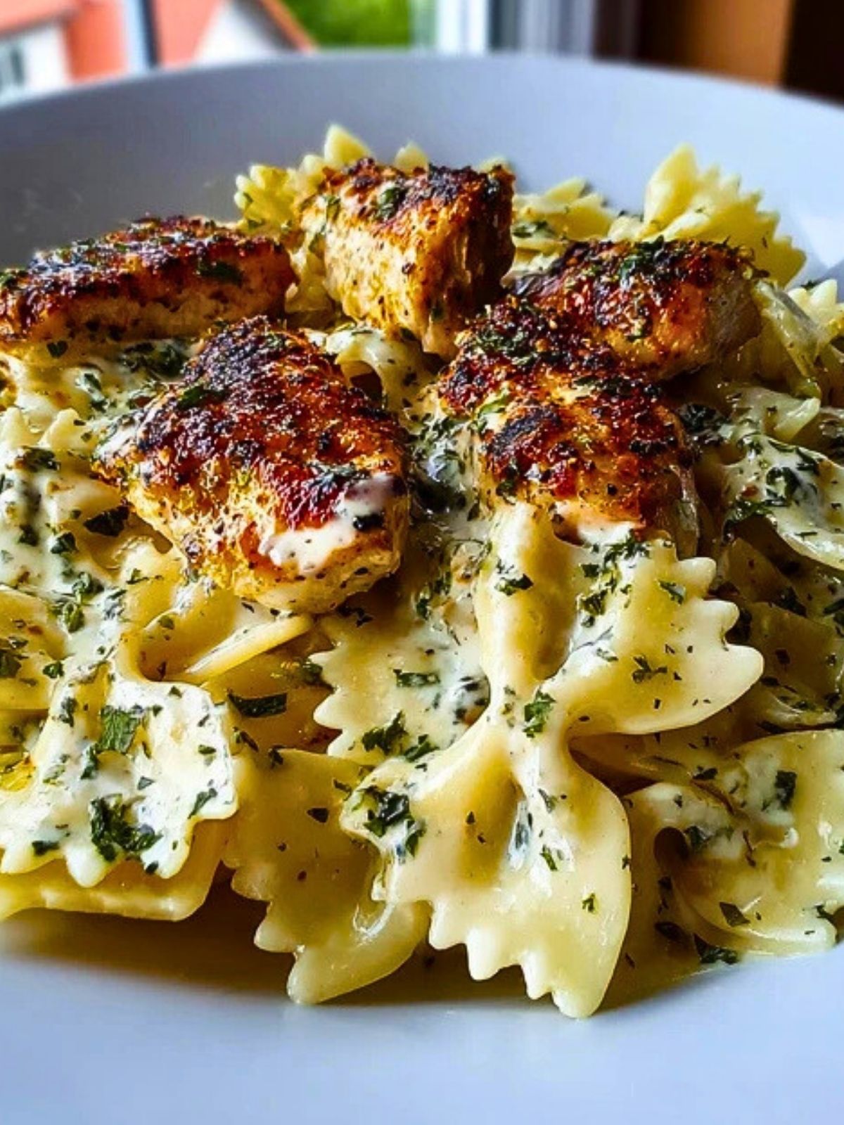 Add the cooked pasta to the cream sauce, stirring gently to coat. Top with the seared chicken and let it sit in the sauce for a few minutes to absorb flavor. Sprinkle parsley over the top before serving.