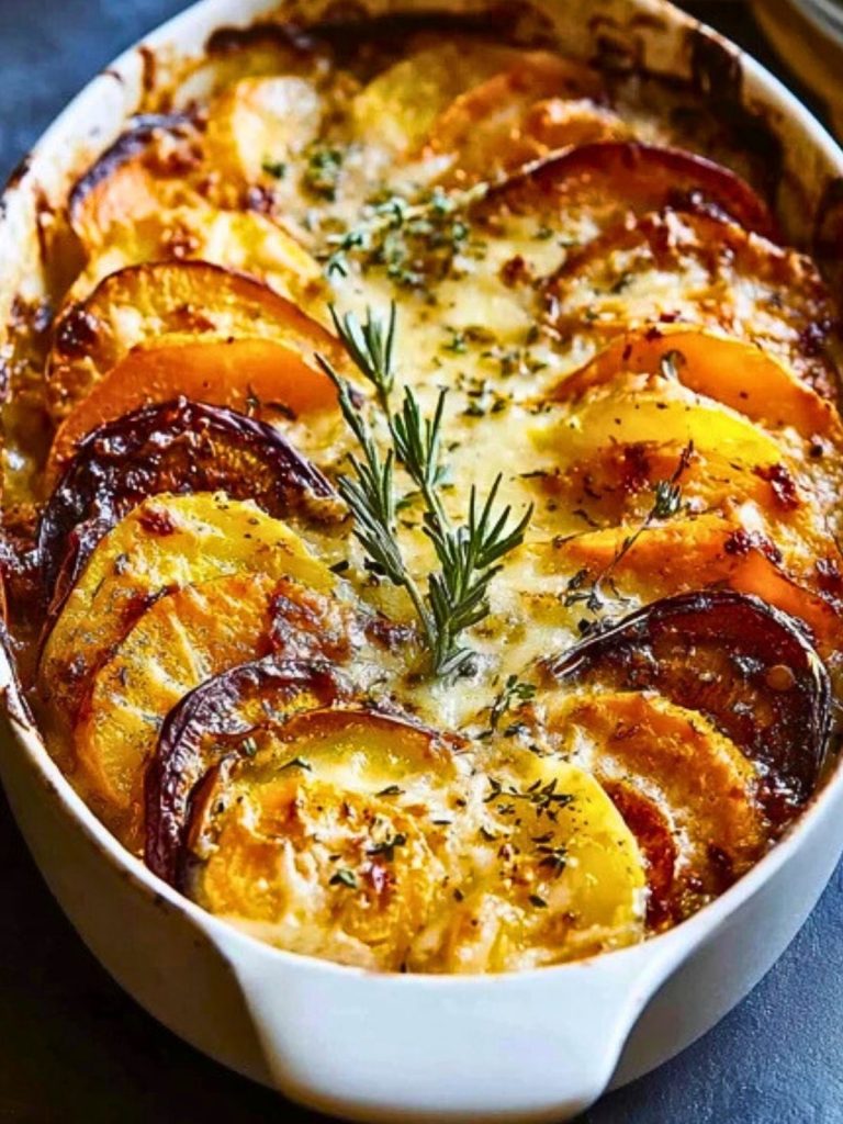 This gratin is all about texture and contrast: the tender bite of sweet potatoes, the buttery smoothness of Yukon Golds, and the robust flavor of beets or turnips, all enveloped in a creamy garlic cheese sauce. It’s hearty enough to stand alone but also shines as a side dish for roasted meats or holiday mains.