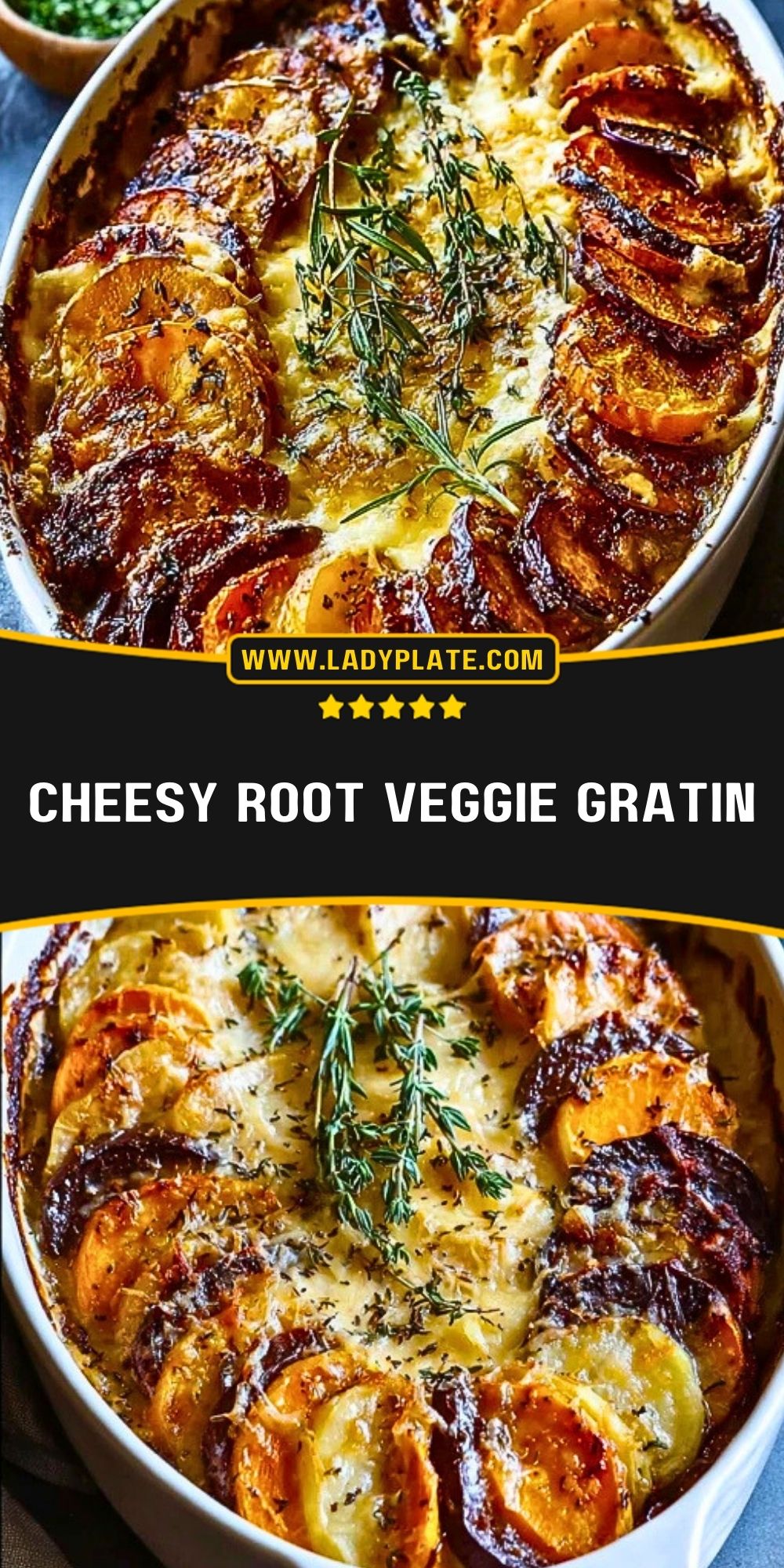 Keywords: root veggie gratin, cheesy casserole, vegetable bake