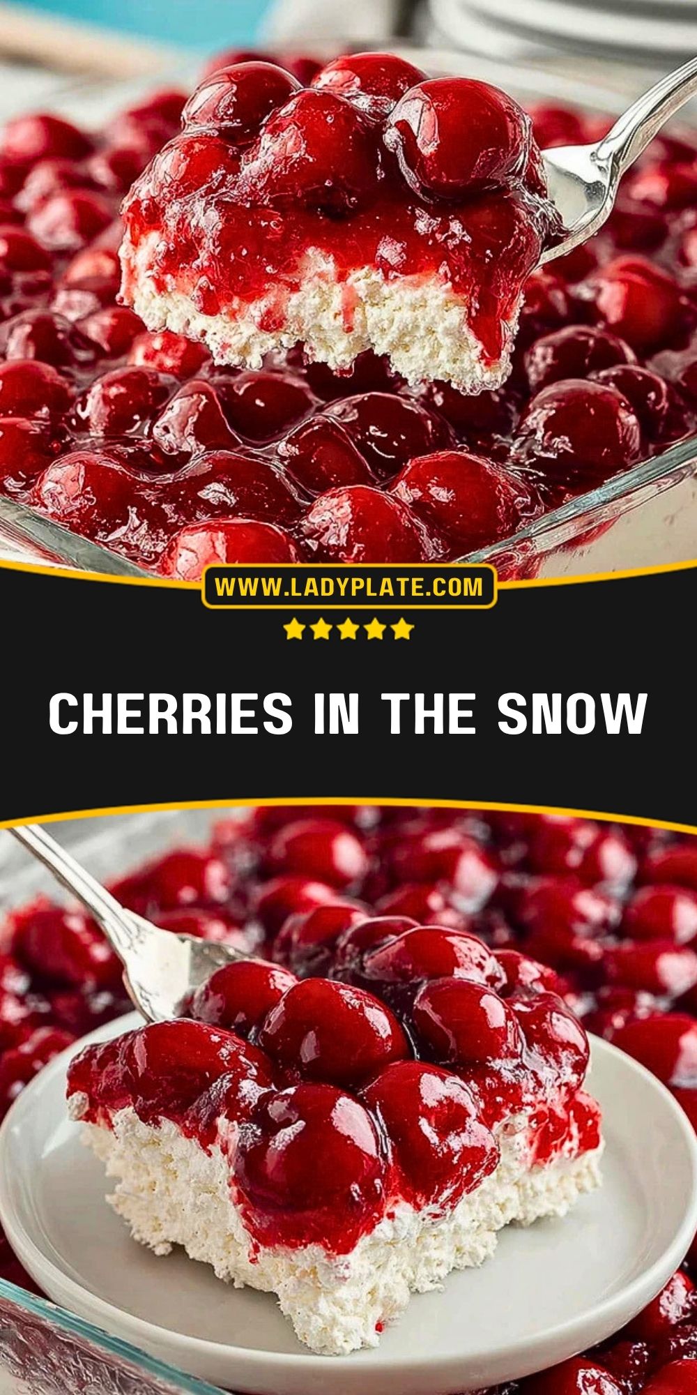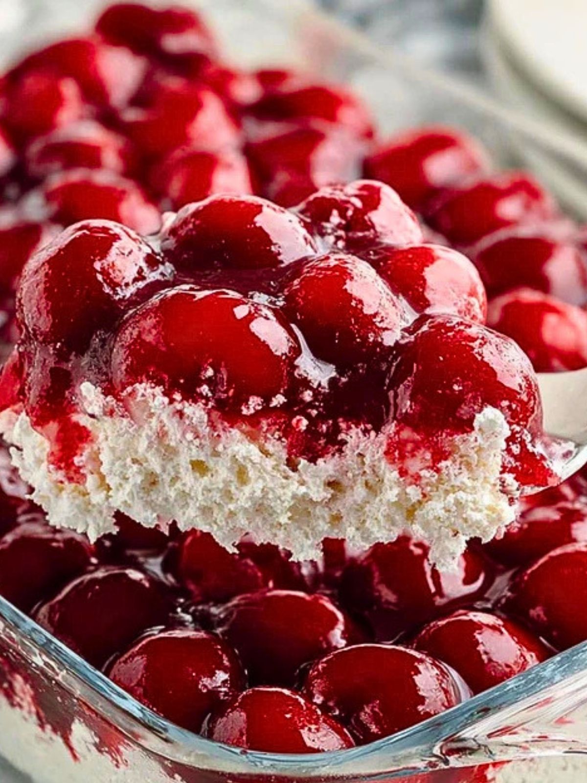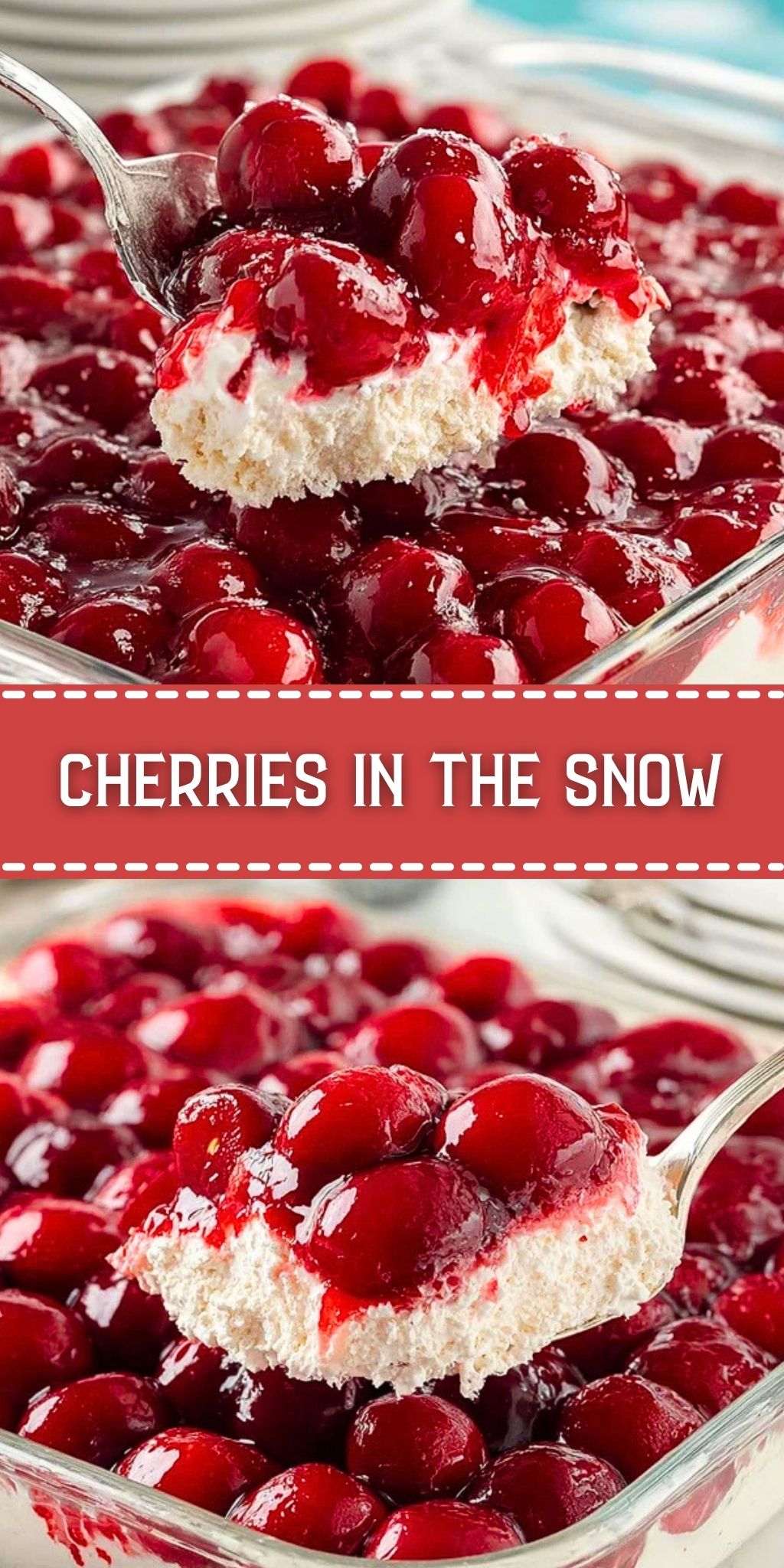 Cherries in the Snow is best served cold, straight from the refrigerator, when the filling is firm and the topping is glossy and fresh. It is a lovely dessert for spring and summer meals, but it also fits right in on Thanksgiving, Christmas, Easter, and other holiday tables. For a pretty presentation, spoon it into dessert bowls or cut it into squares if it has chilled long enough to hold shape well.