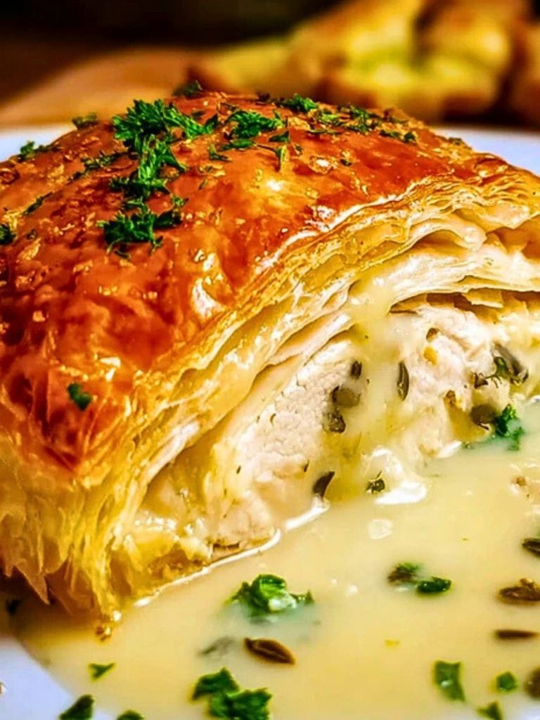 This show-stopper is perfect for holiday dinners, date nights, or any time you want to impress without sweating it in the kitchen. With layers of tender chicken breast, sautéed mushrooms, and herby cheese wrapped in buttery puff pastry, it strikes a balance between gourmet and comforting. Once you slice into it and that creamy sauce spills onto the plate, you’ll understand the hype.