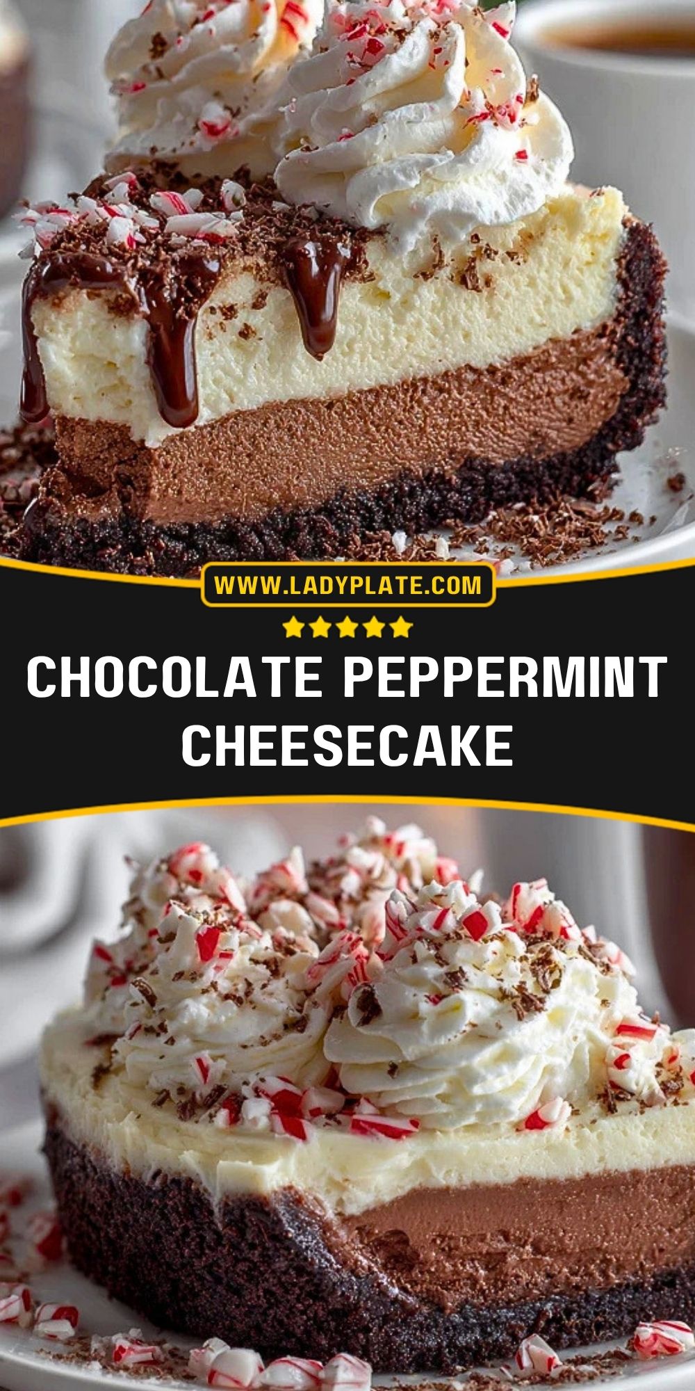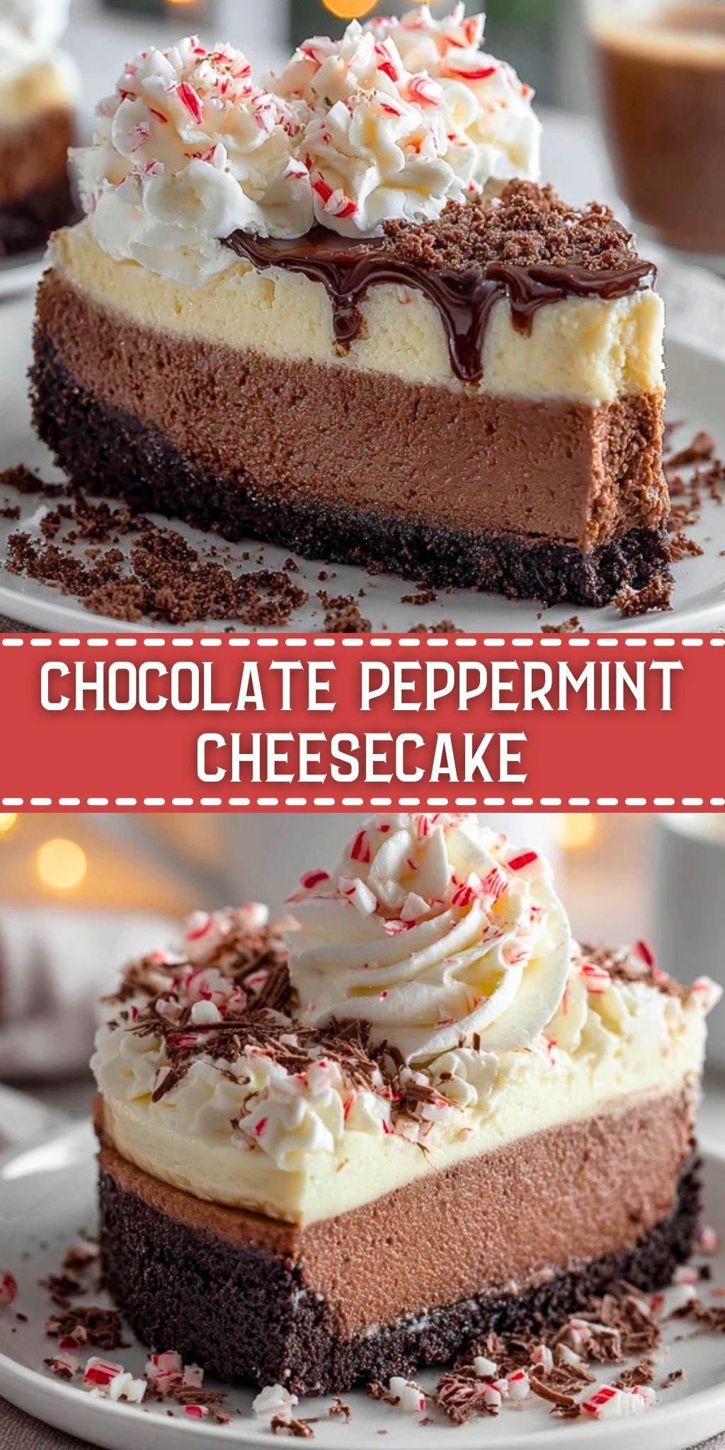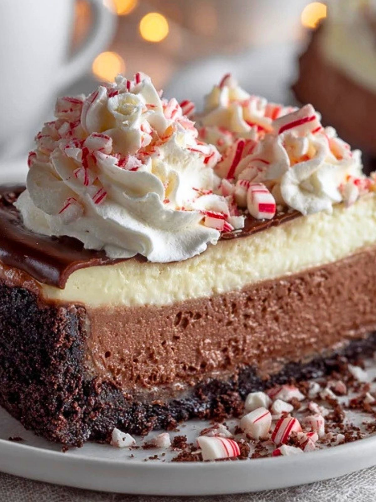 This is the kind of dessert that instantly stands out. With its dark chocolate cookie crust, rich chocolate cheesecake layer, smooth vanilla peppermint cheesecake layer, glossy chocolate topping, and whipped cream finish, every slice feels festive, elegant, and completely worth the chill time.
