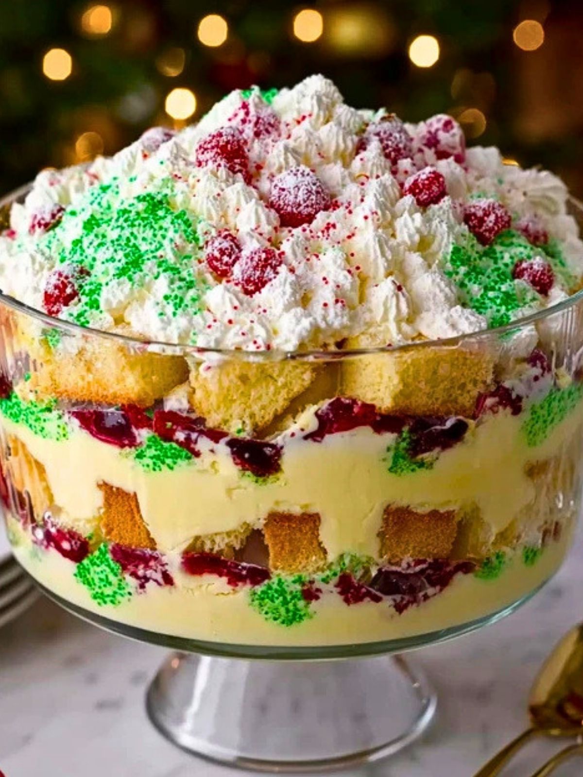This dessert is rich, playful, and perfect for Christmas gatherings when you want something easy to assemble ahead of time. The layers give it that classic trifle look, while the familiar flavors of vanilla cake, creamy filling, and cheerful red and green accents make it feel nostalgic and party-ready.
