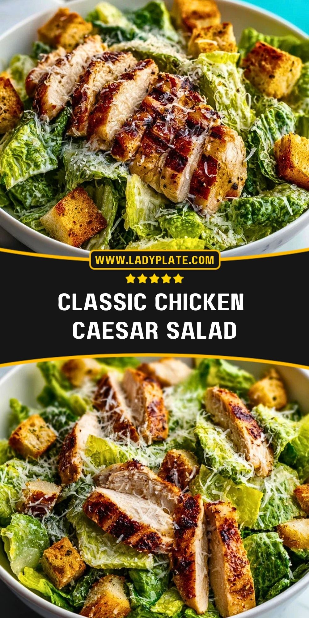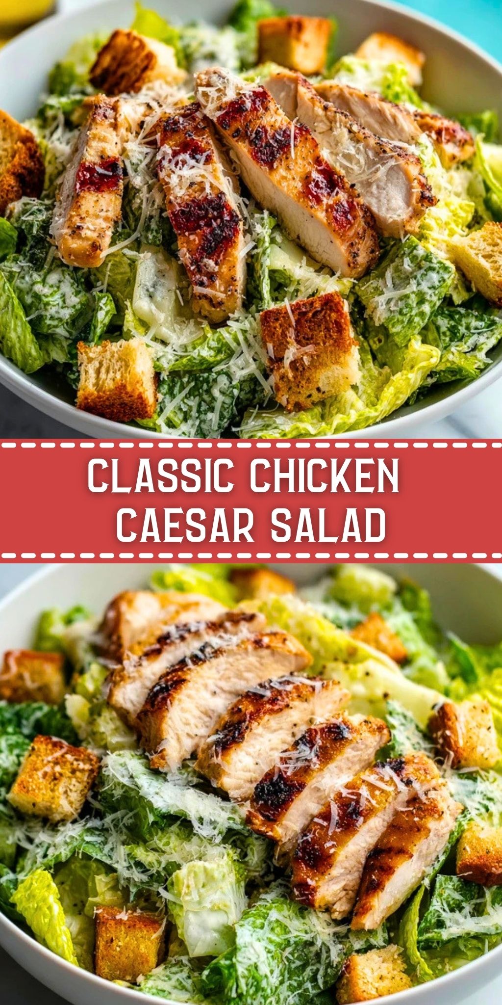 Classic Chicken Caesar Salad is best served right after tossing so the romaine stays cold and crisp and the croutons keep their crunch. It pairs nicely with warm bread, soup, roasted vegetables, or even a simple fruit plate if you want to round out the meal without making it heavy.