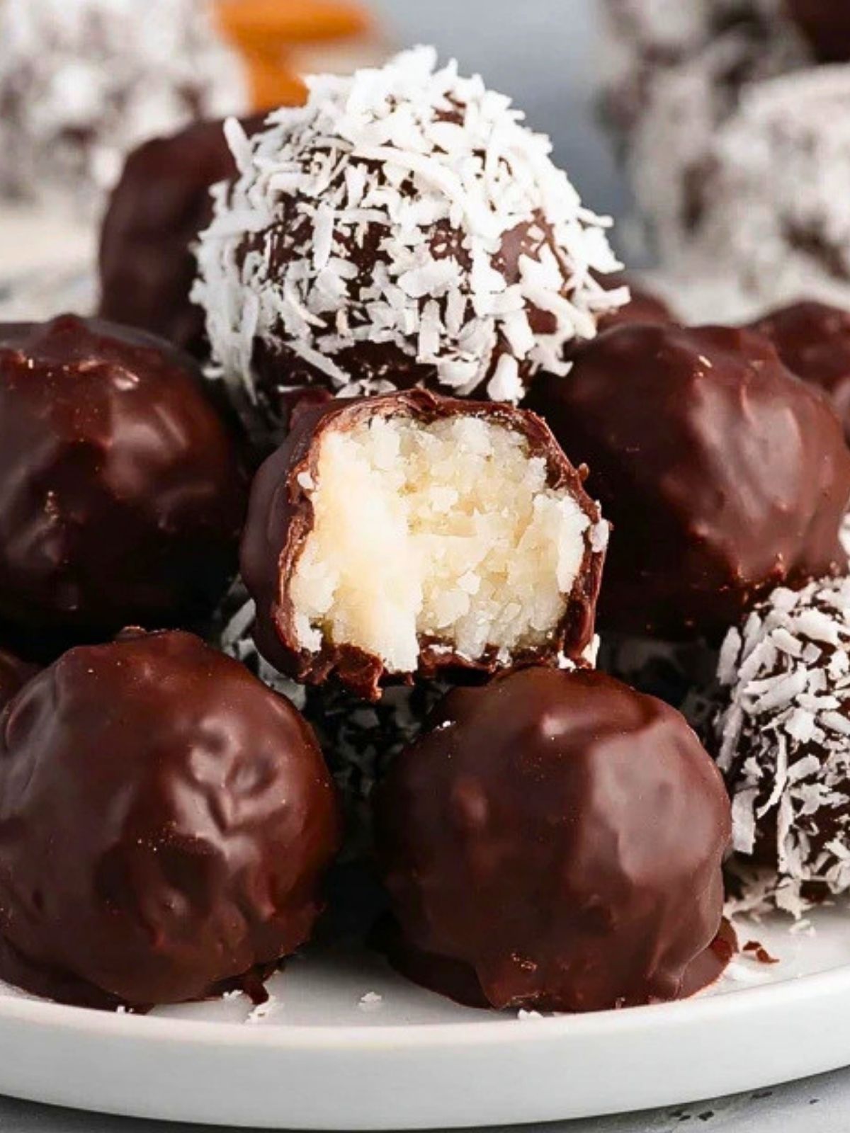 Coconut Chocolate Balls are best served slightly chilled or at cool room temperature. When cold, the chocolate shell stays firm and the center feels dense and creamy. If you leave them out for a few minutes before serving, the coconut filling softens a bit and tastes even richer.