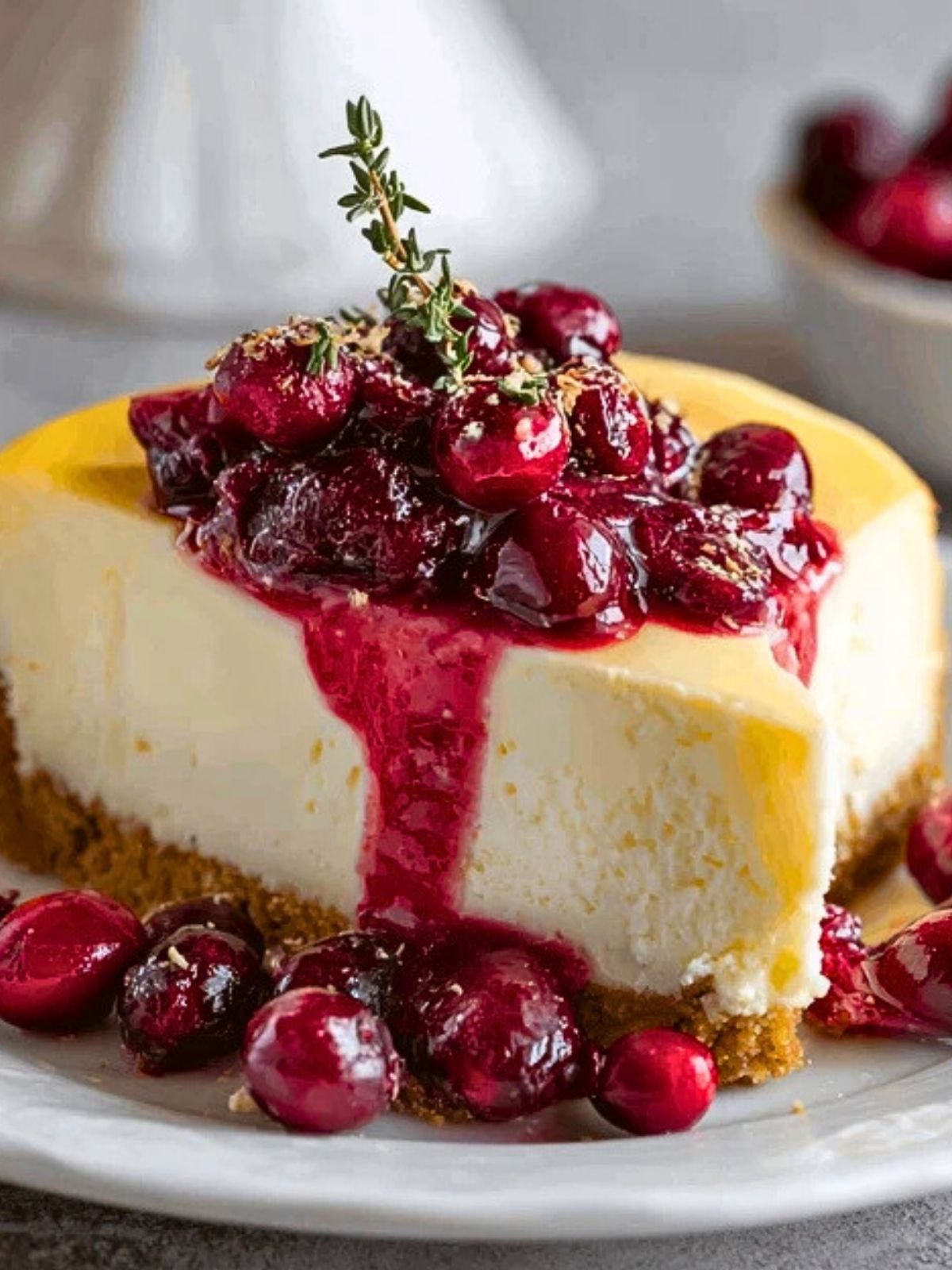 Spoon the cranberry topping generously over the cheesecake and garnish with fresh thyme or orange zest for a festive finish.