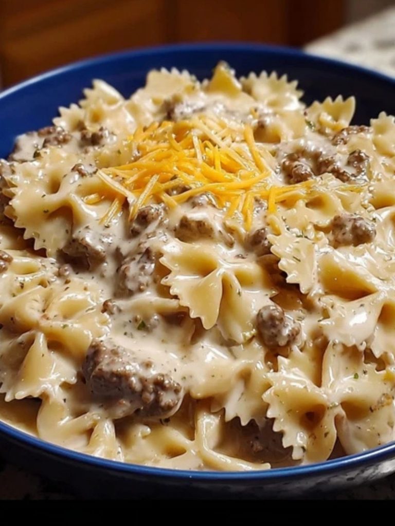 Creamy Beef and Bowtie Pasta is a comforting, hearty weeknight meal made with tender ground beef, rich cream cheese, and bowtie pasta coated in a velvety garlic-herb cream sauce. It’s finished with melty cheddar for a deliciously satisfying dinner the whole family will love.