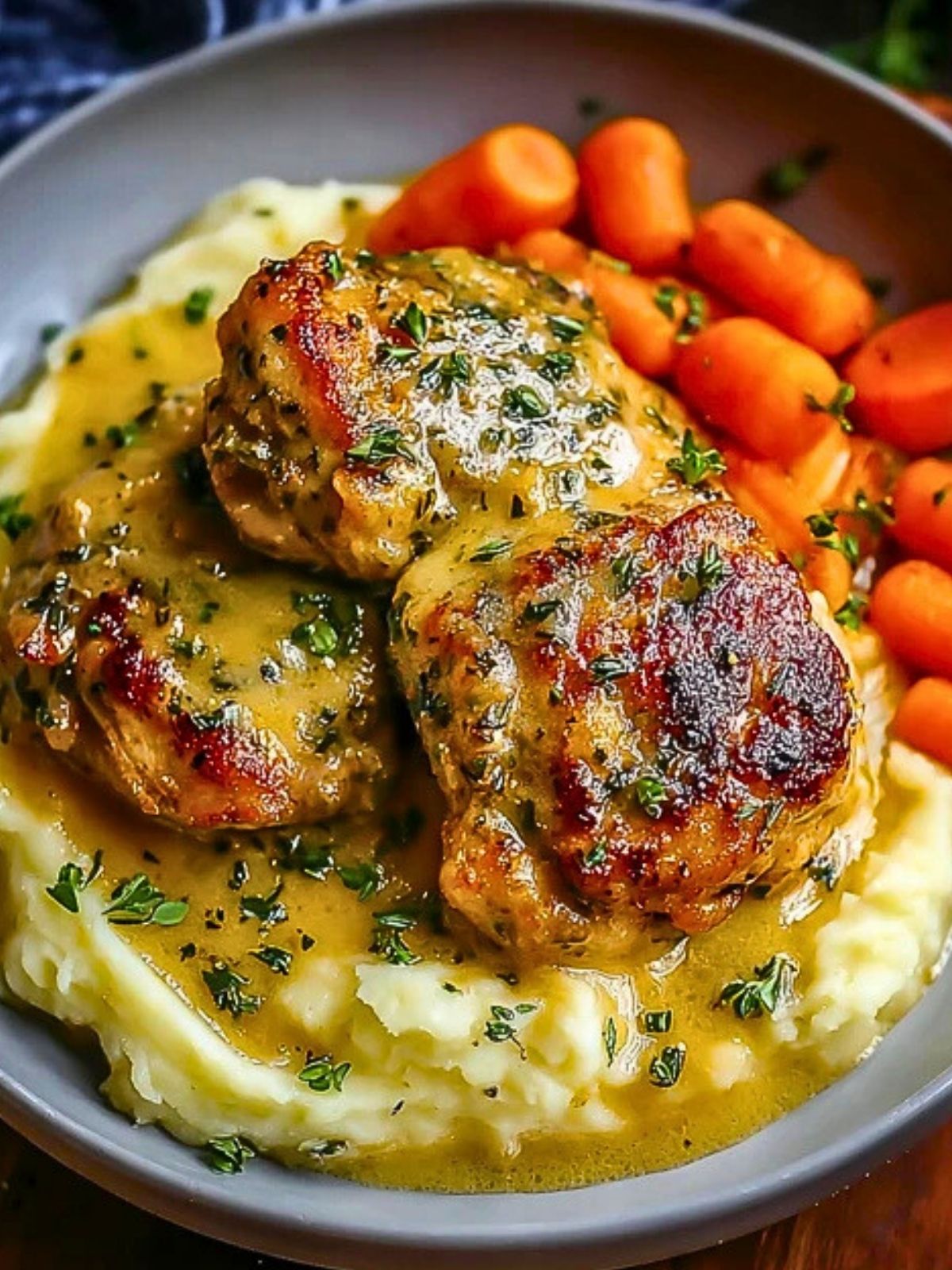 Plate a generous scoop of mashed potatoes, top with chicken and a ladle of herb gravy. Add the buttery carrots on the side and finish with a sprinkle of fresh herbs.