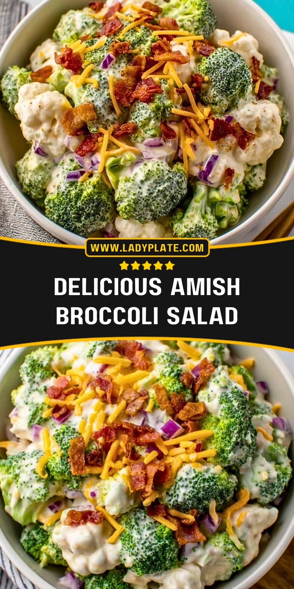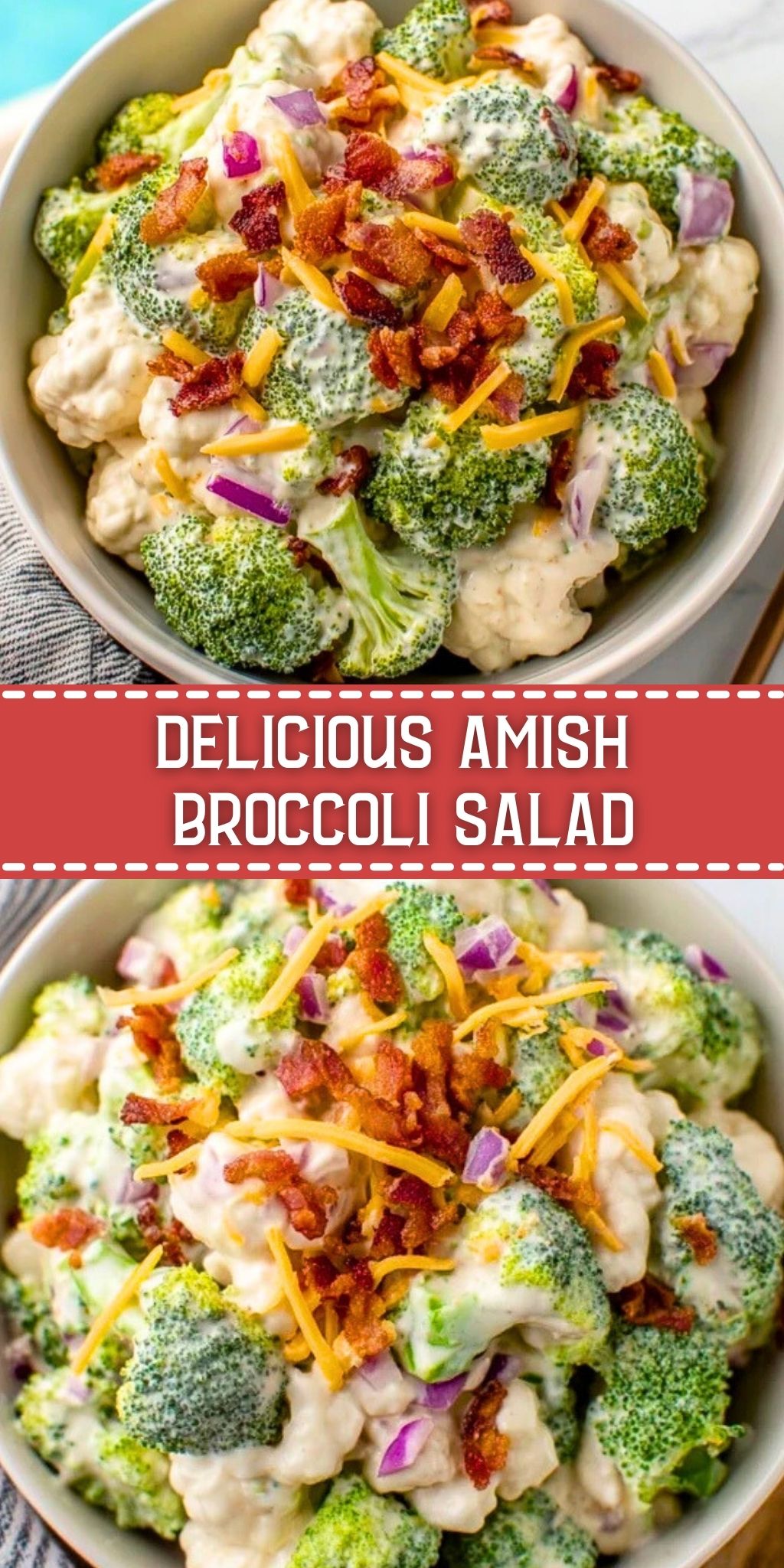 This *Delicious Amish Broccoli Salad* is the ultimate cold salad—crisp broccoli and cauliflower florets, smoky bacon, sharp cheddar, and red onions tossed in a creamy, tangy-sweet dressing. It’s the perfect make-ahead side dish for potlucks, holiday spreads, and easy lunches, ready to steal the show with every bite.