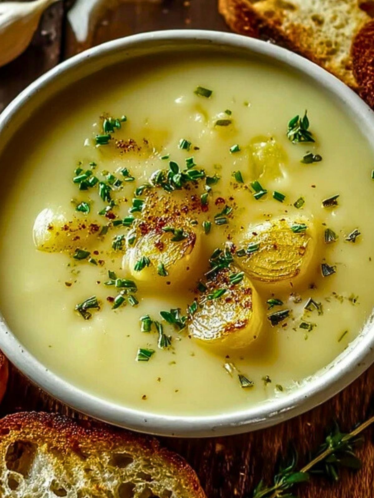 This creamy, comforting Country French Garlic Soup showcases the mellow sweetness of roasted garlic and tender potatoes, blended into a silky smooth bowl of rustic flavor. With a hint of fresh thyme and a garnish of chives, it’s the kind of elegant farmhouse soup that feels like a hug in a bowl.