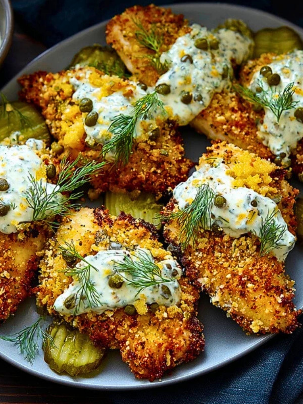 Once the chicken is crispy and bubbling, top each piece with a dollop of herbed caper sauce and a fresh sprig of dill. Serve immediately for maximum crunch.