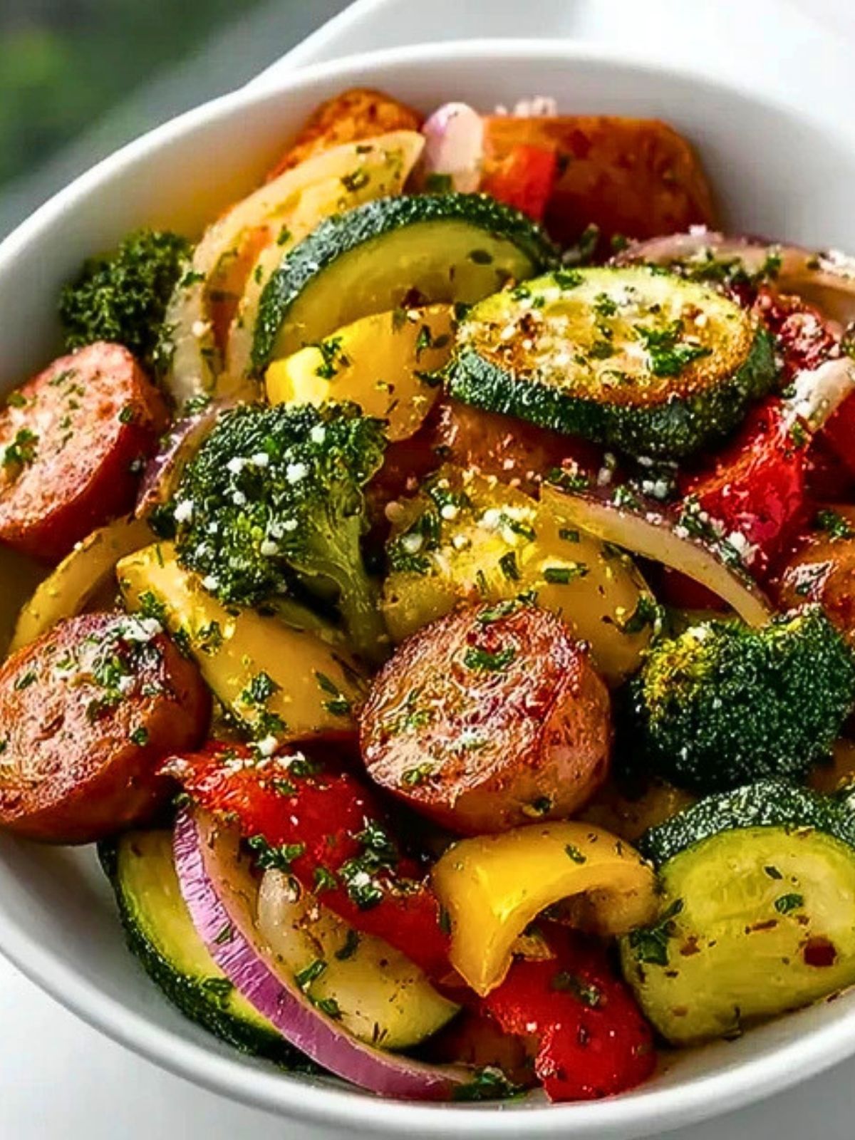 5. Roast in the oven for 25–30 minutes, flipping halfway through, until sausage is golden and vegetables are tender with crisp edges.