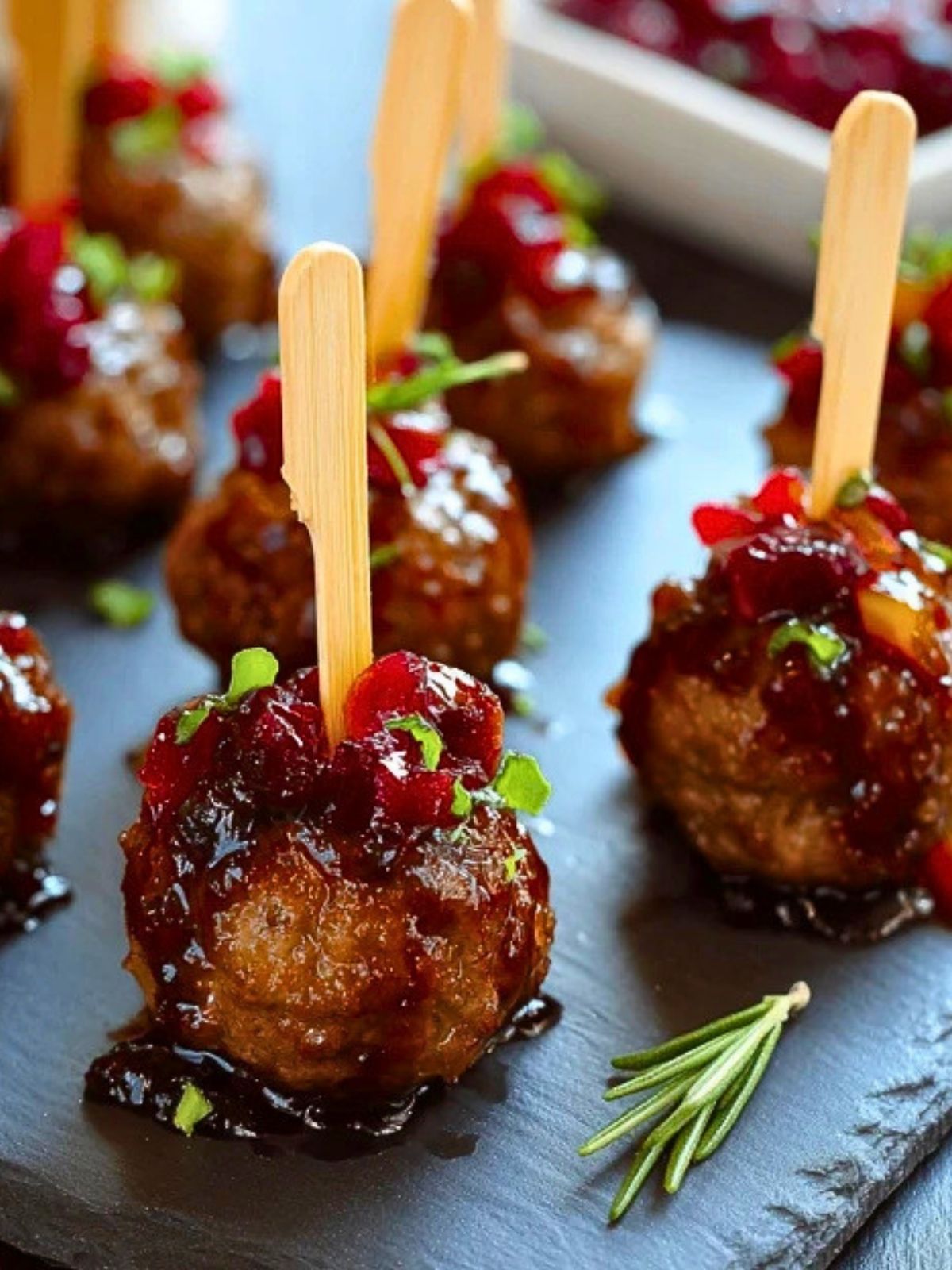 For the topping and glaze, cranberry sauce or a chunky berry-style sauce adds sweetness, color, and that sticky finish that makes these skewers stand out on a serving tray. Chili sauce or barbecue sauce adds tang and body, balancing the sweetness. A little honey can round everything out if you want a shinier, sweeter coating. Fresh rosemary or parsley on top gives the finished appetizer a festive look and a fresh contrast.