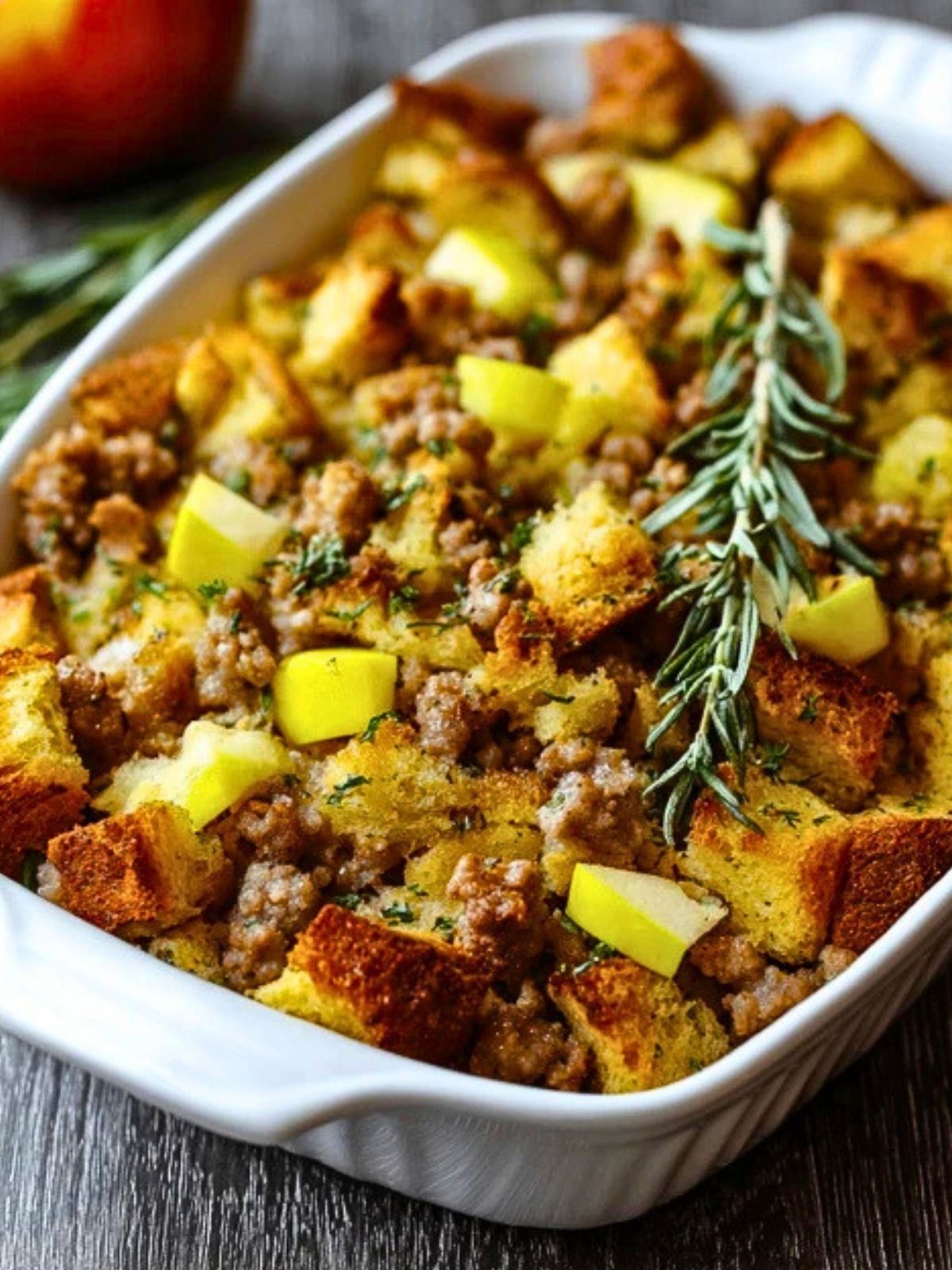This is the kind of side dish that fits beautifully on a holiday table, but it is just as welcome beside a simple roast chicken or cozy Sunday dinner. The contrast of crisp golden bread cubes, juicy sausage, and soft apple pieces gives it plenty of texture, while rosemary, thyme, onion, and celery keep every bite balanced and deeply flavorful.