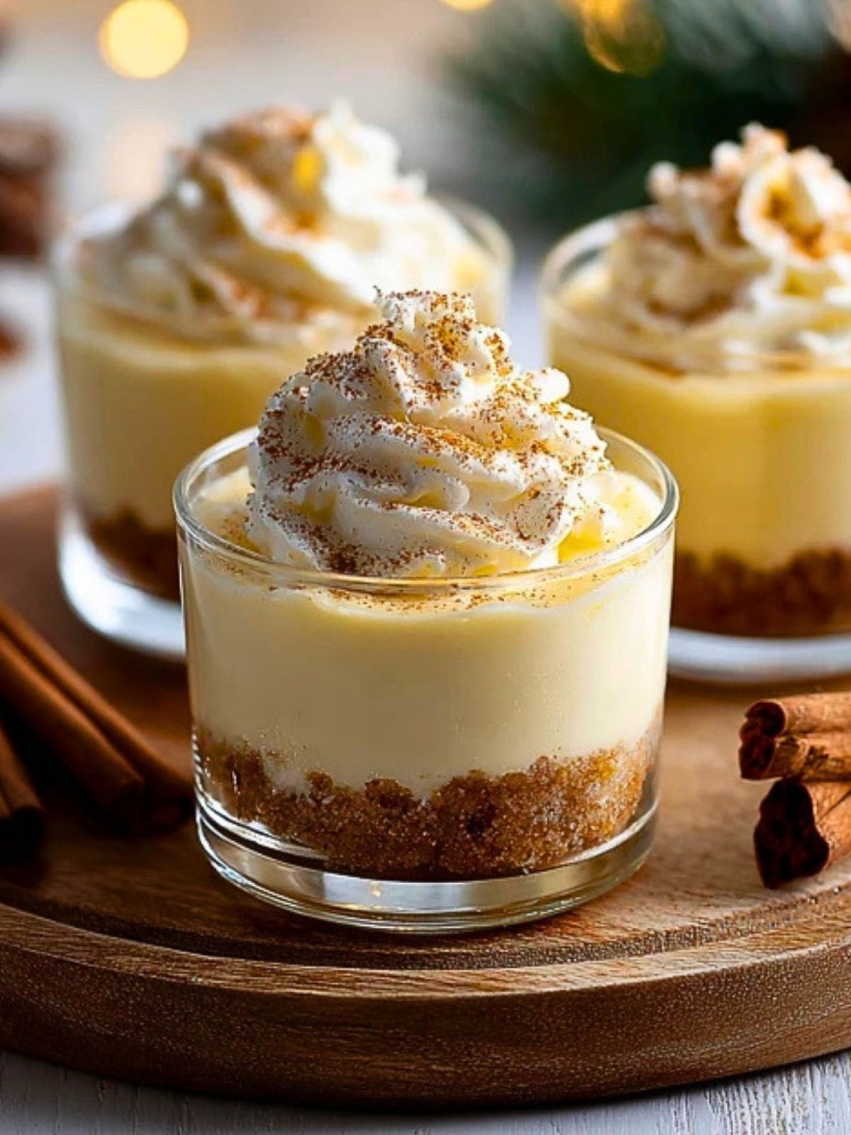 Eggnog Mousse Cups are best served well chilled, straight from the refrigerator. They work beautifully after a holiday meal because they feel creamy and indulgent without being as heavy as cake or pie. Serve them in clear glasses so the crumb base and mousse layers show off.