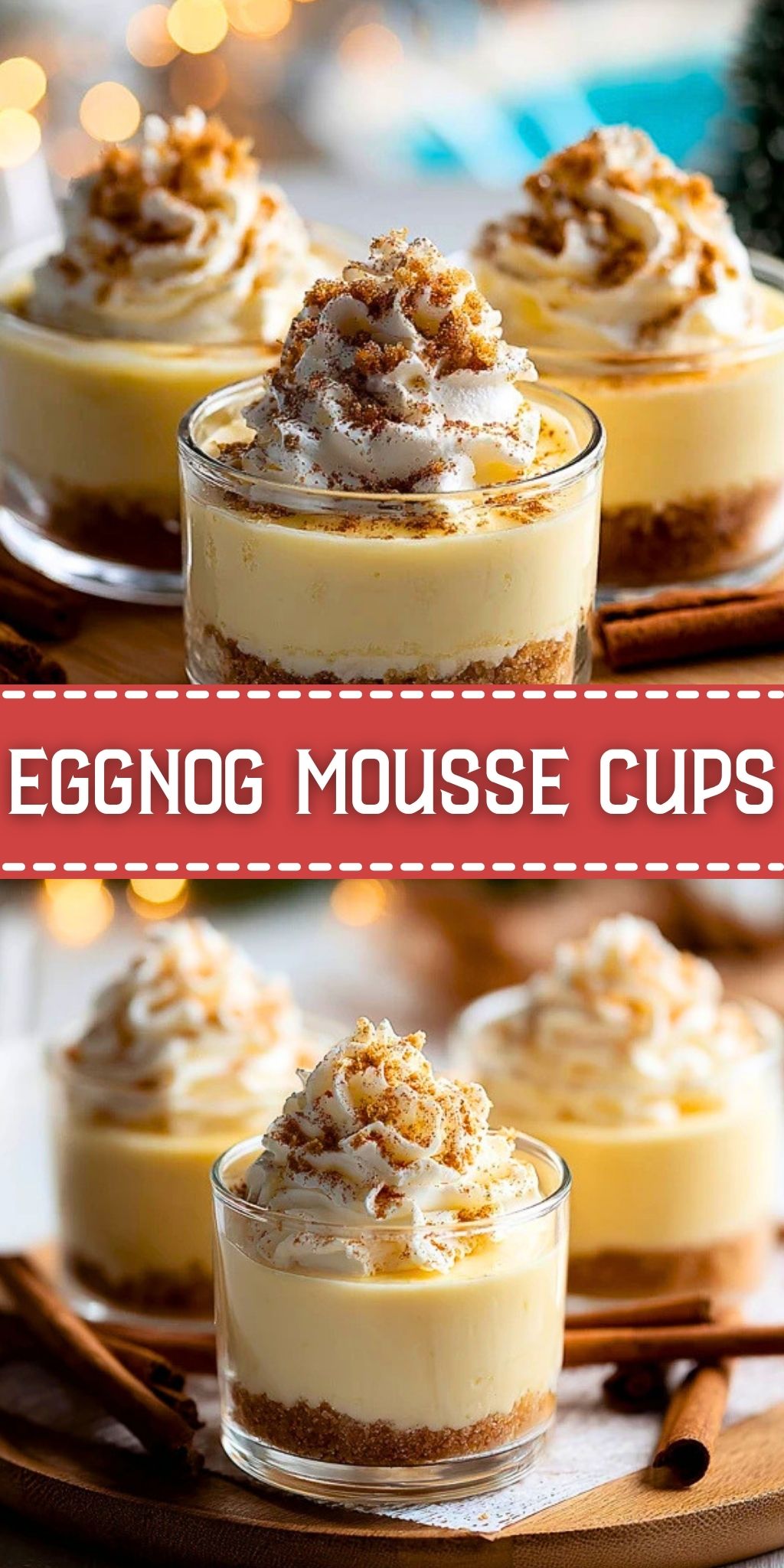 Could a holiday dessert get any cozier than silky eggnog mousse tucked into little cups with a buttery crumb base and a swirl of whipped cream on top?