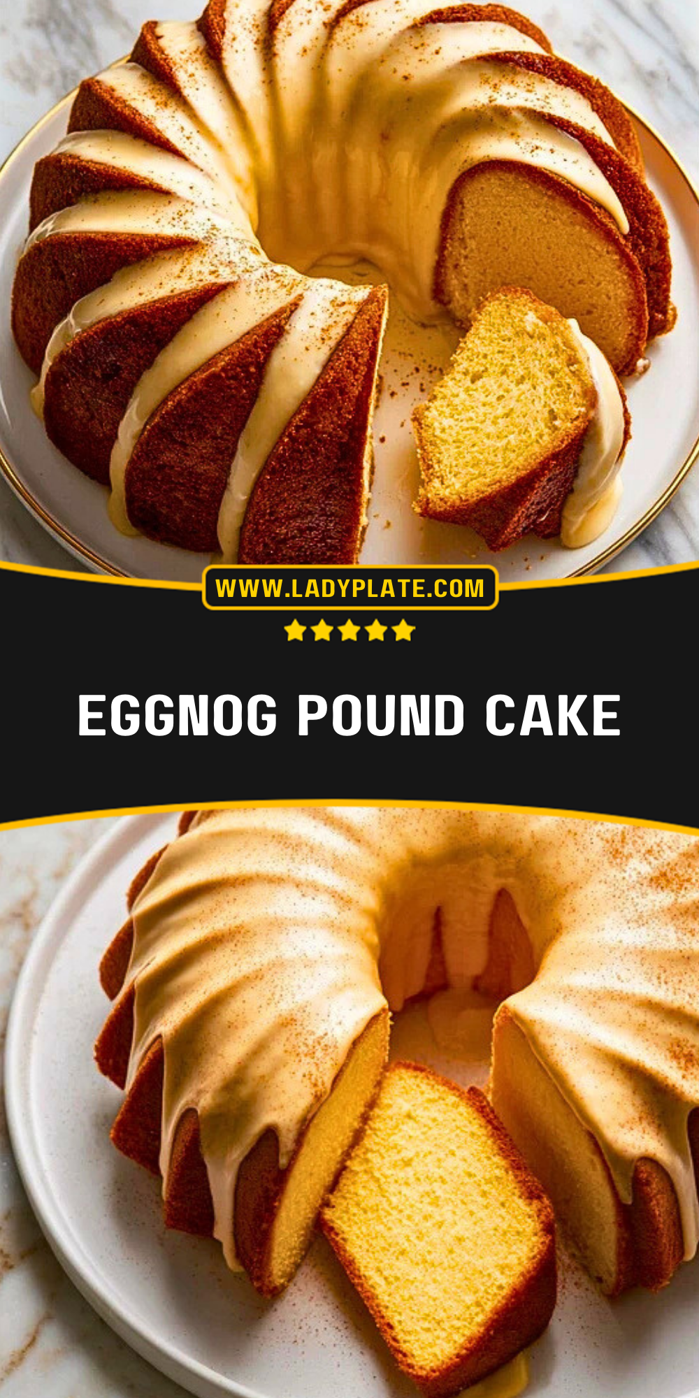 If you give this Eggnog Pound Cake a try, I’d love to hear from you. Did you add rum? Try a different glaze? Let me know in the comments below. You can also follow my daily recipes on Pinterest: LadyPlate on Pinterest for even more inspiration.