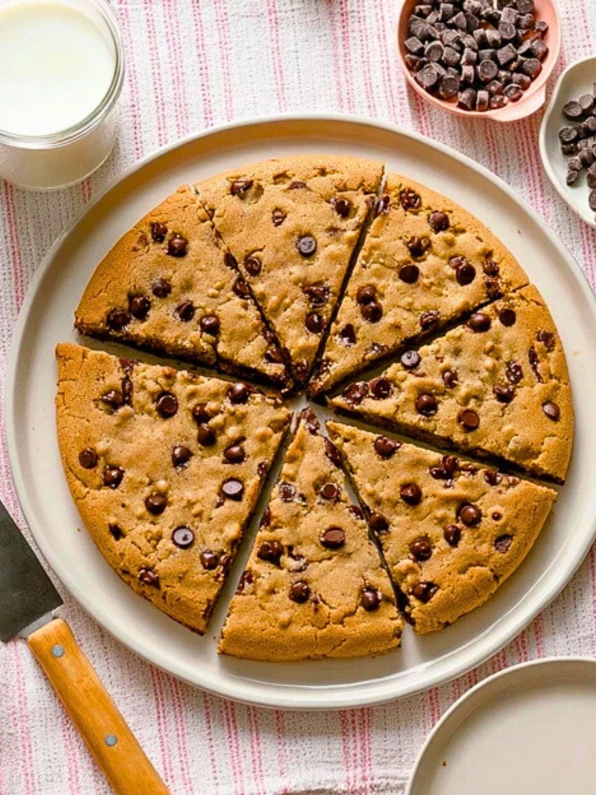 Baking a single giant cookie not only saves time over scooping dozens of dough balls, but it also guarantees a perfectly chewy center with slightly crisp edges. It gives that freshly baked, bakery-style cookie feel right from your home oven. Once sliced into wedges, it feels like a cookie pizza—what’s not to love?