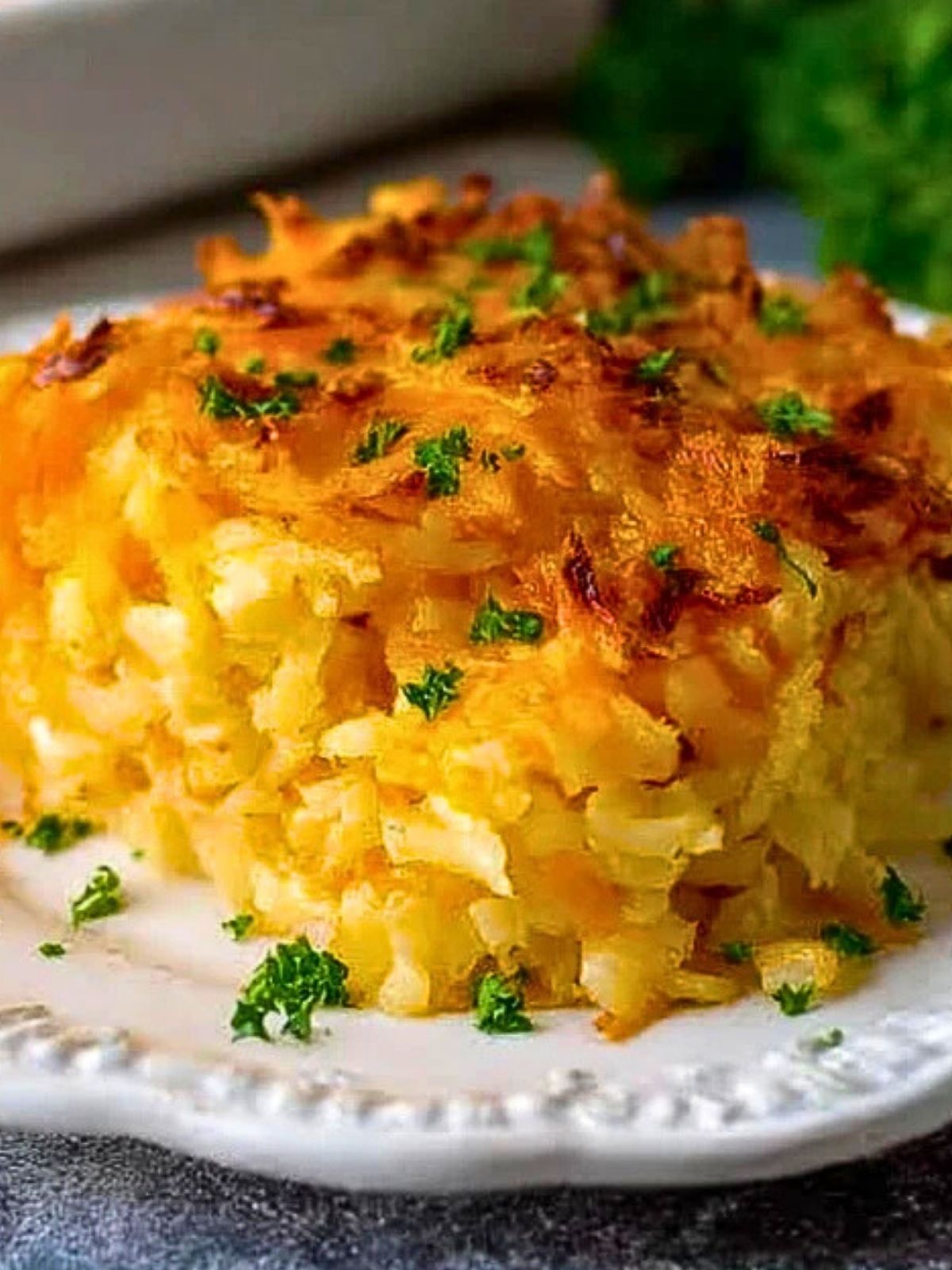 This casserole shines brightest when served hot and fresh out of the oven. The top layer is at its crispiest and the interior is perfectly creamy. It pairs well with everything from baked ham and roasted chicken to brunch staples like scrambled eggs and fruit salad.