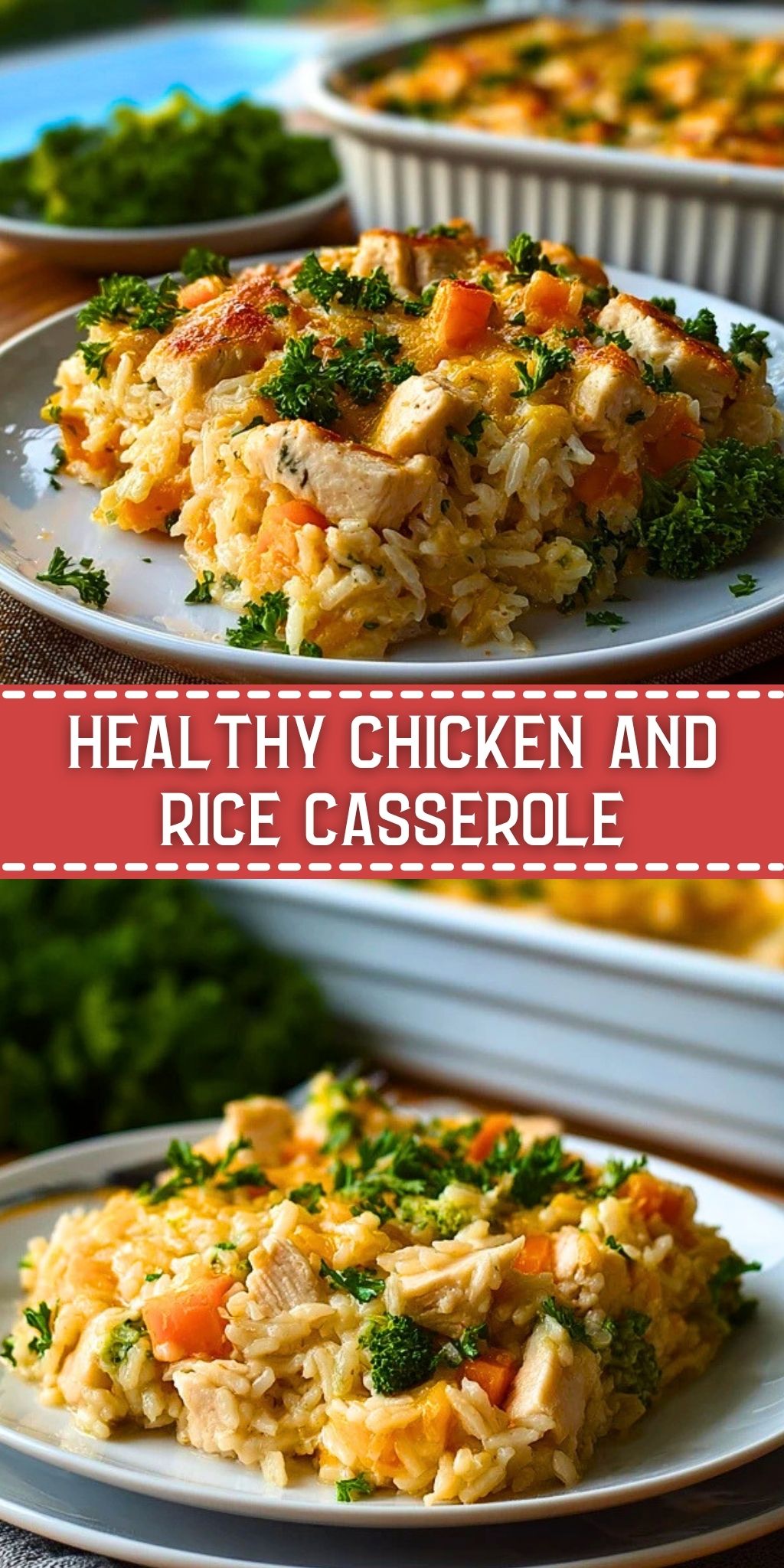 Healthy Chicken and Rice Casserole is easy to serve straight from the baking dish with a spoon or spatula. It pairs well with a crisp green salad, roasted vegetables, or a light fruit side if you want to keep the meal fresh and balanced. For a heartier dinner, you can serve it with warm whole grain rolls or an extra sprinkle of cheese on top.
