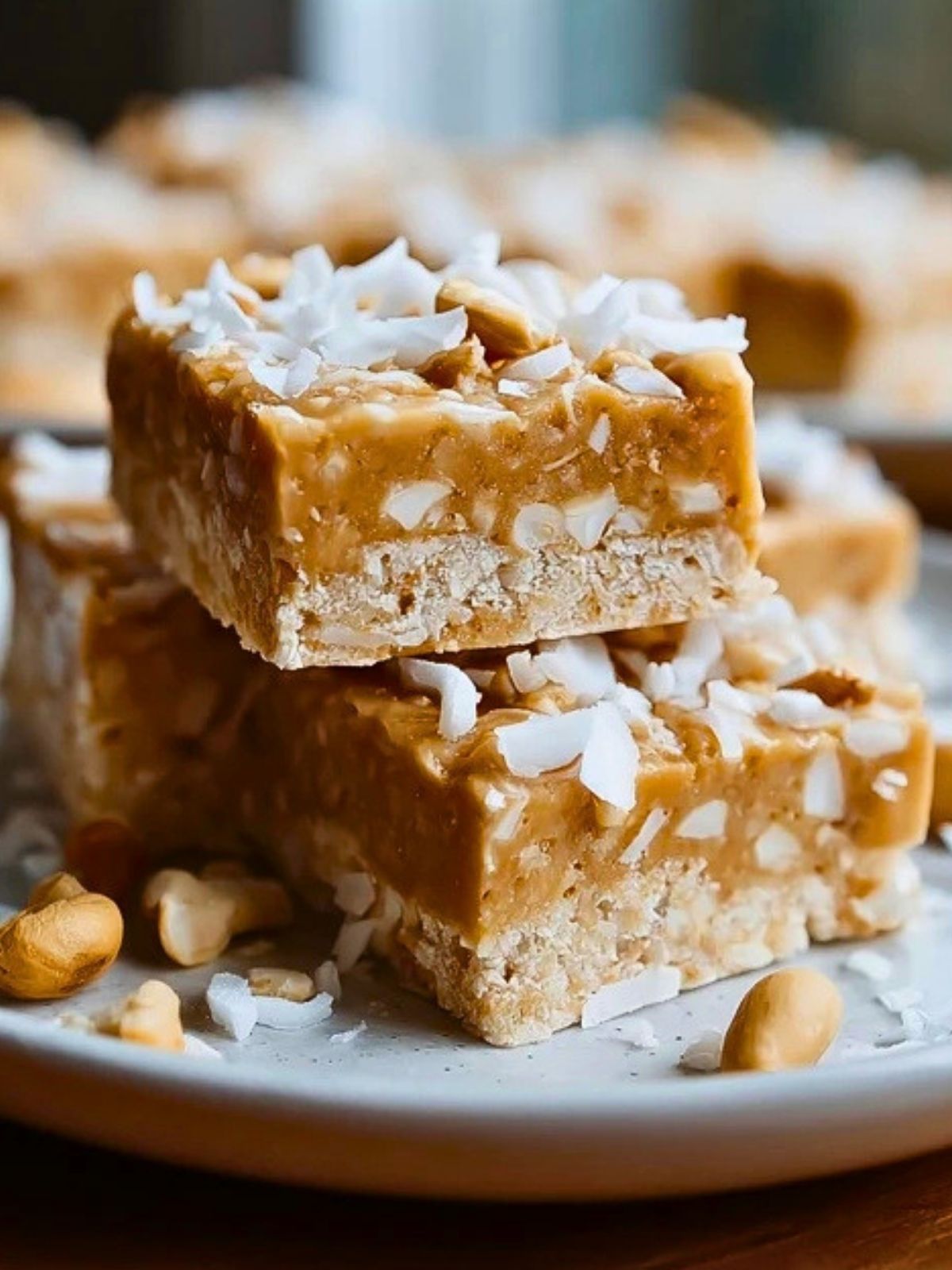 Spread a thin extra layer of warmed nut butter mixture over the top if you want that glossy finish shown in the bars. Sprinkle with a little extra coconut and chopped nuts so the top looks textured and inviting.