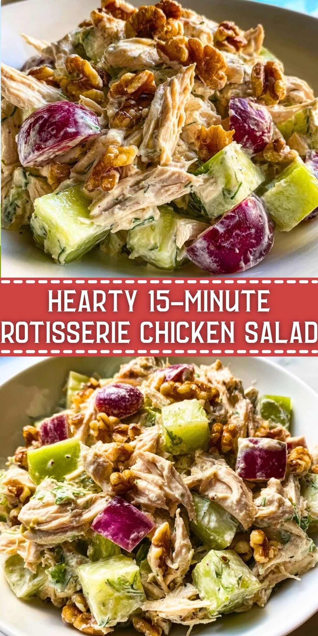 This Hearty 15-Minute Rotisserie Chicken Salad is a quick, no-cook dish that’s full of texture and flavor. Juicy rotisserie chicken is tossed with crisp cucumbers, sweet grapes, and crunchy walnuts, all wrapped in a creamy herb dressing. Perfect for meal prep, light lunches, or refreshing dinners, it’s ready in a flash and stays delicious for days.