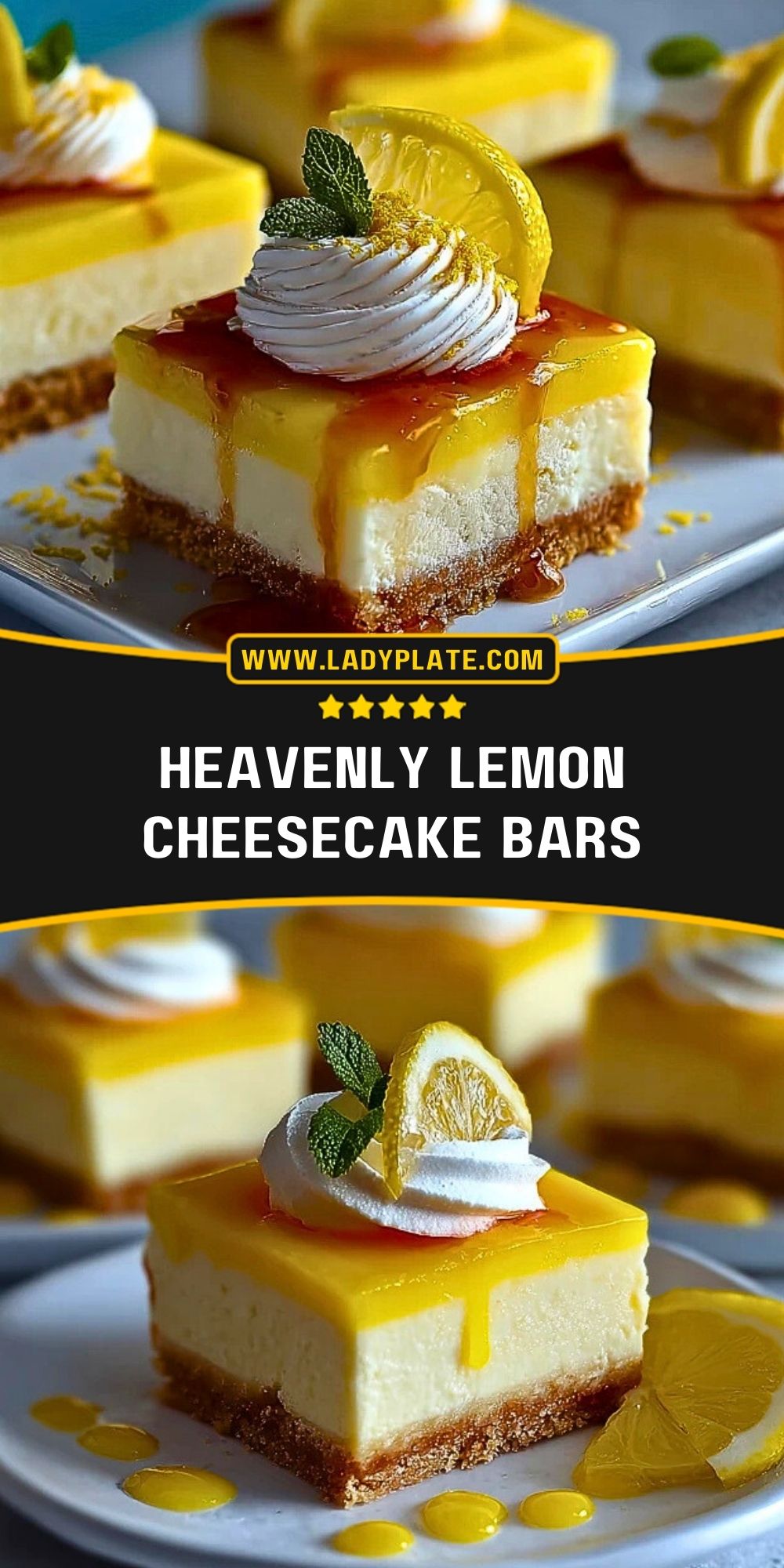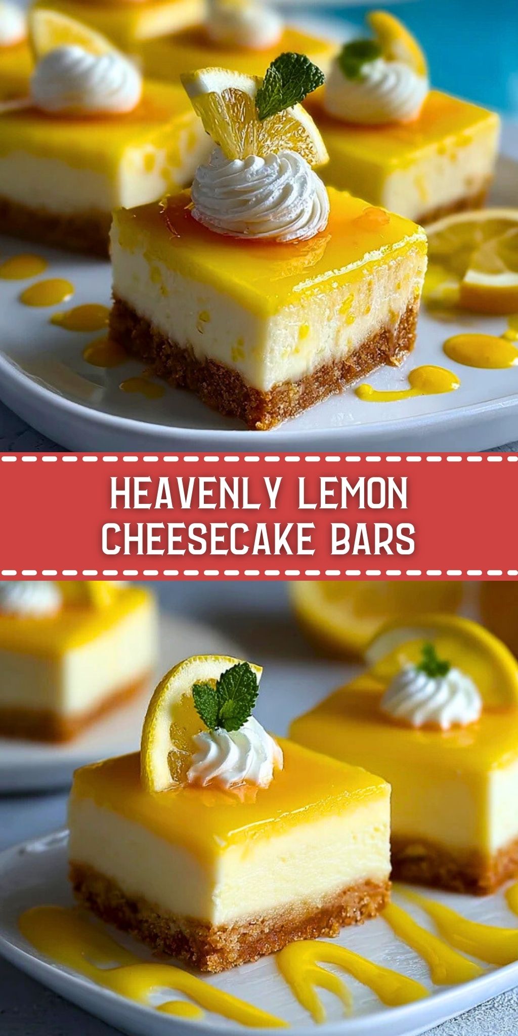 These Heavenly Lemon Cheesecake Bars combine a buttery graham cracker crust, rich and smooth cheesecake, and a bright lemon curd topping for the ultimate citrus dessert. Perfectly chilled and elegantly garnished, they’re a stunning addition to any spring or summer dessert table.