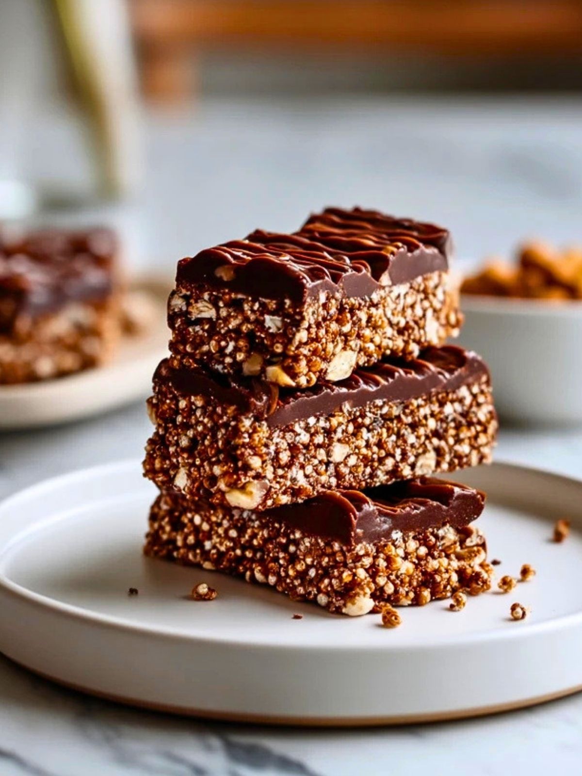 Each bite has that craveable balance of chewy and crunchy, with puffed quinoa adding a light snap and a glossy chocolate topping making them feel just a little extra. They work beautifully as a post-workout snack, a quick breakfast bite, or a make-ahead treat to keep in the fridge for busy days.