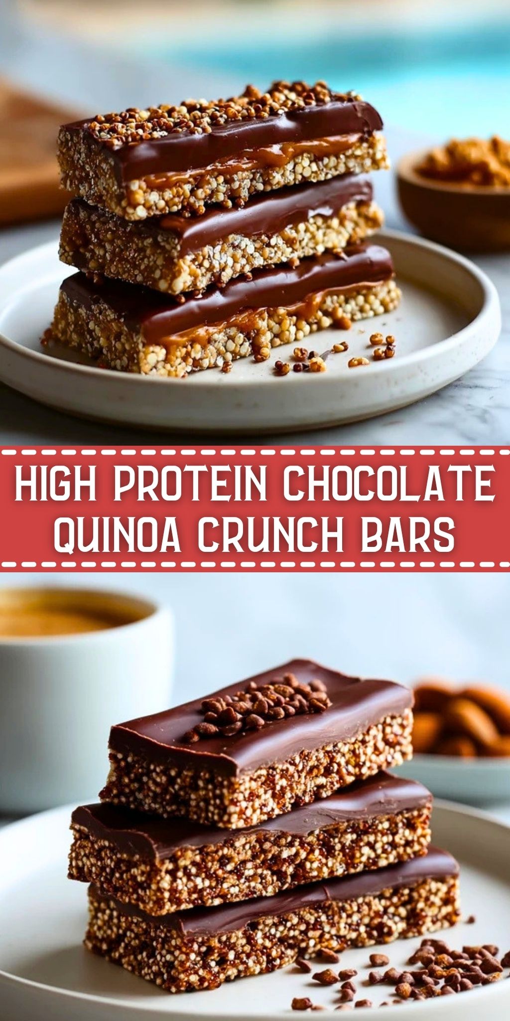 These High Protein Chocolate Quinoa Crunch Bars are best served chilled or at cool room temperature, especially if you want the topping to stay firm and the bars to keep their shape. They pair well with coffee in the morning, work nicely as a gym bag snack, and also make a smart afternoon pick-me-up when you want something sweet that still feels filling.