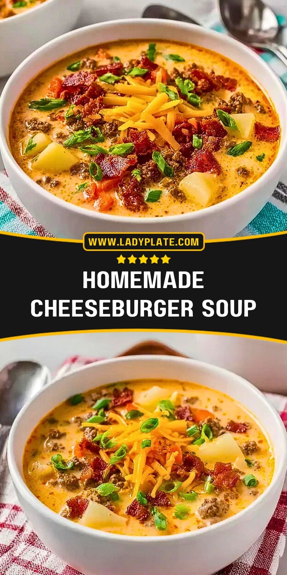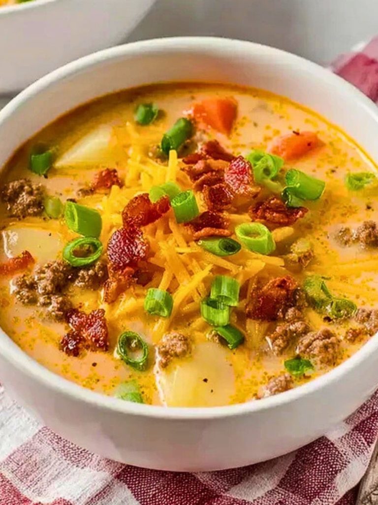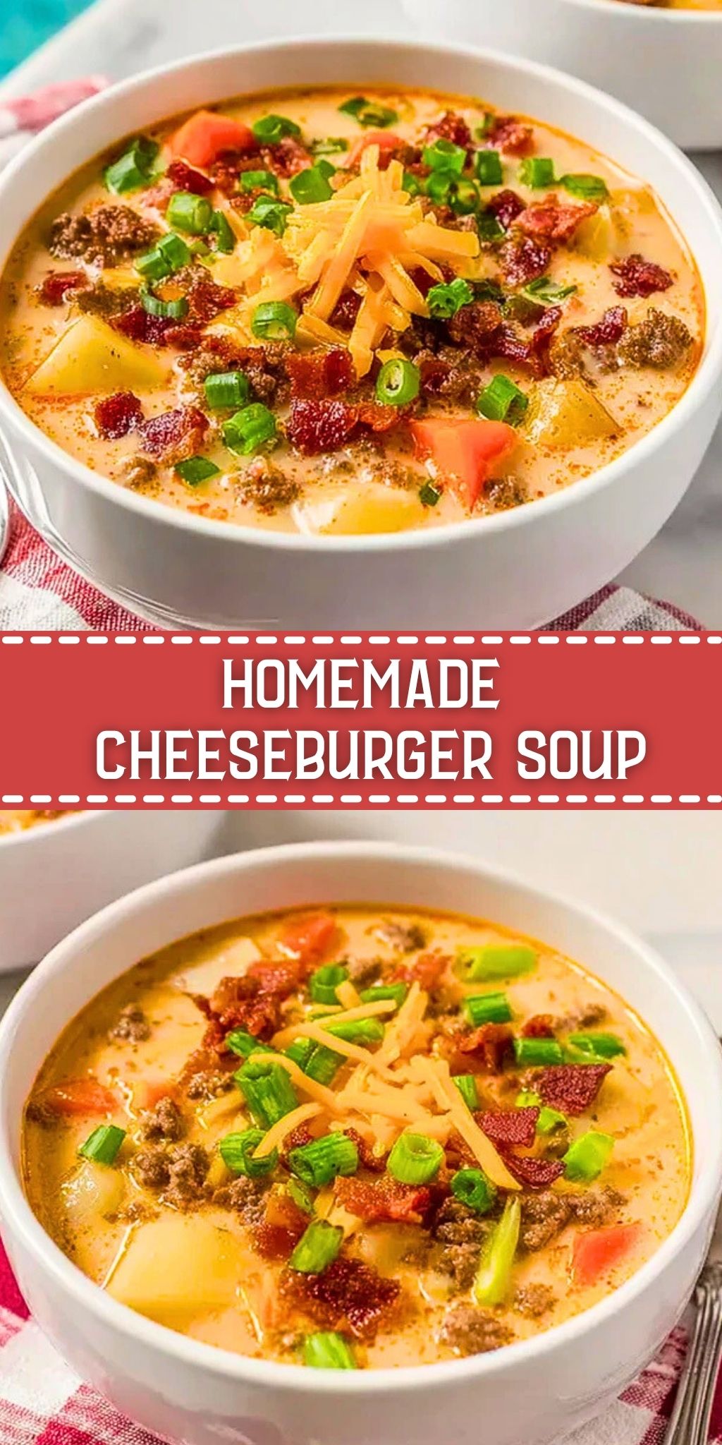 Homemade Cheeseburger Soup is a rich and creamy comfort food that combines the flavors of a classic cheeseburger in a warm, hearty soup. Loaded with tender potatoes, seasoned ground beef, melted cheddar, and crisp bacon, this cozy bowl is perfect for chilly evenings or weekend family dinners. It’s easy to prepare, stores beautifully, and tastes even better the next day.