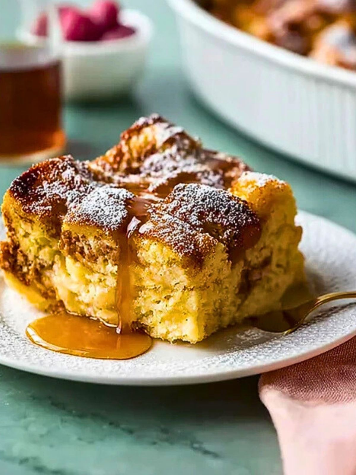 This casserole is best served warm, straight from the oven when the top is still crisp and the custard interior is soft and fragrant. Cut generous squares and serve with powdered sugar or a pour of warm maple syrup for a decadent touch. It pairs perfectly with fresh berries or a scoop of vanilla Greek yogurt for balance.