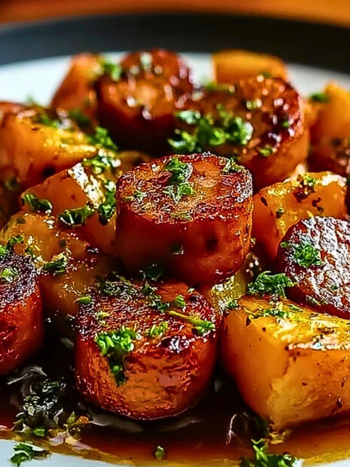 A cozy one-pan meal that brings together golden sweet potatoes and smoky sausage, all wrapped in a sticky honey garlic glaze. It’s a sweet-savory combo that sears perfectly in the skillet, making for an effortless yet satisfying dinner.