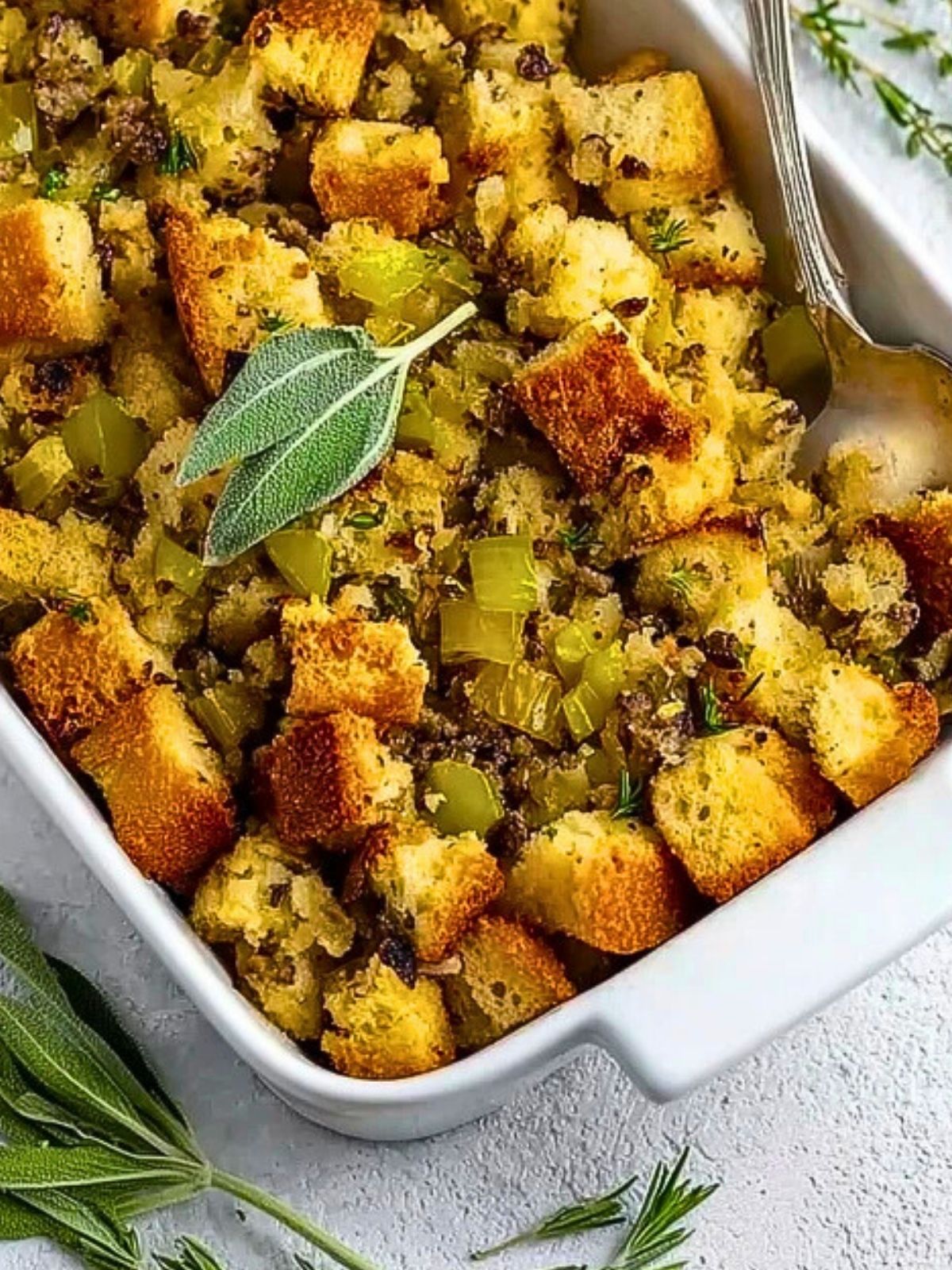 This stuffing is best served warm straight from the oven when the top is perfectly crisp and the inside is fluffy and flavorful. For a beautiful presentation, garnish with a few fresh herb sprigs or a drizzle of melted butter. It pairs wonderfully with roast turkey, baked chicken, or even as a stand-alone dish with a light salad.