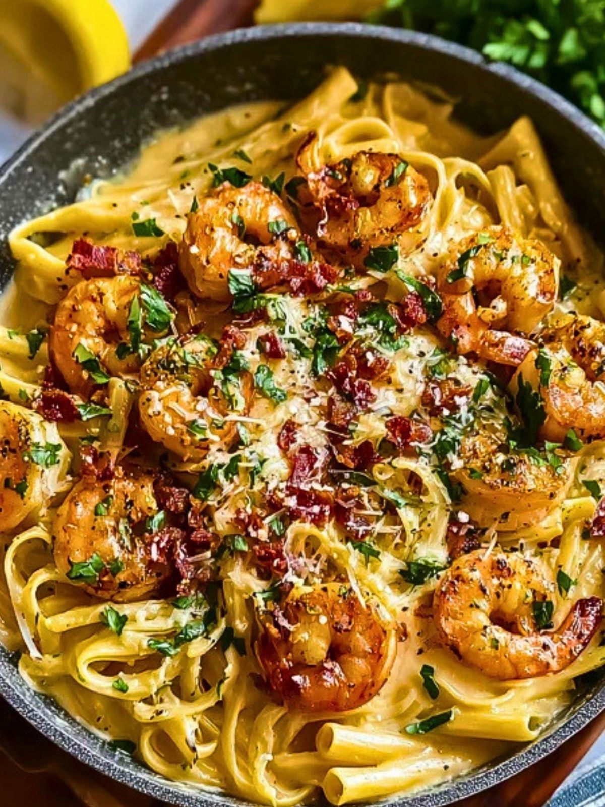 Return the pasta to the skillet and toss until coated in the creamy sauce. Add a splash of reserved pasta water if you want a silkier finish. Fold in most of the bacon, then return the shrimp to the pan just long enough to warm through.