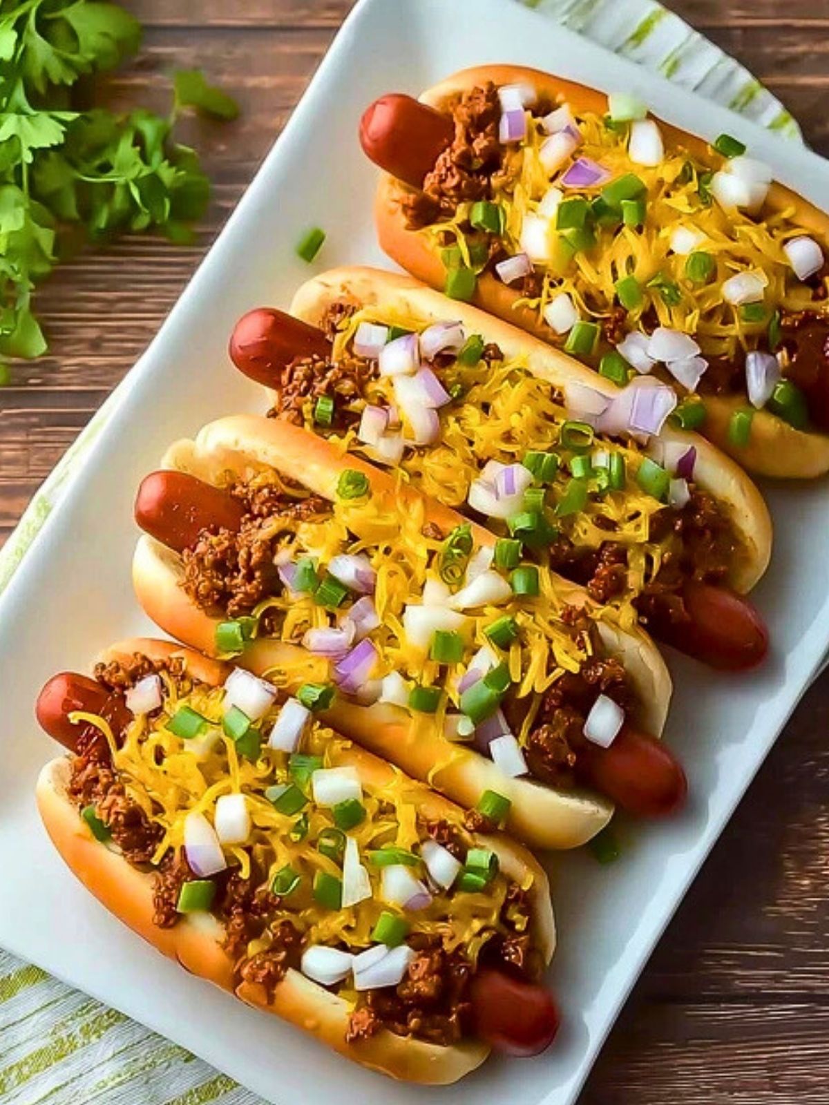 6. Place each hot dog into a bun, top generously with chili, then add cheddar cheese, diced onions, and green onions.