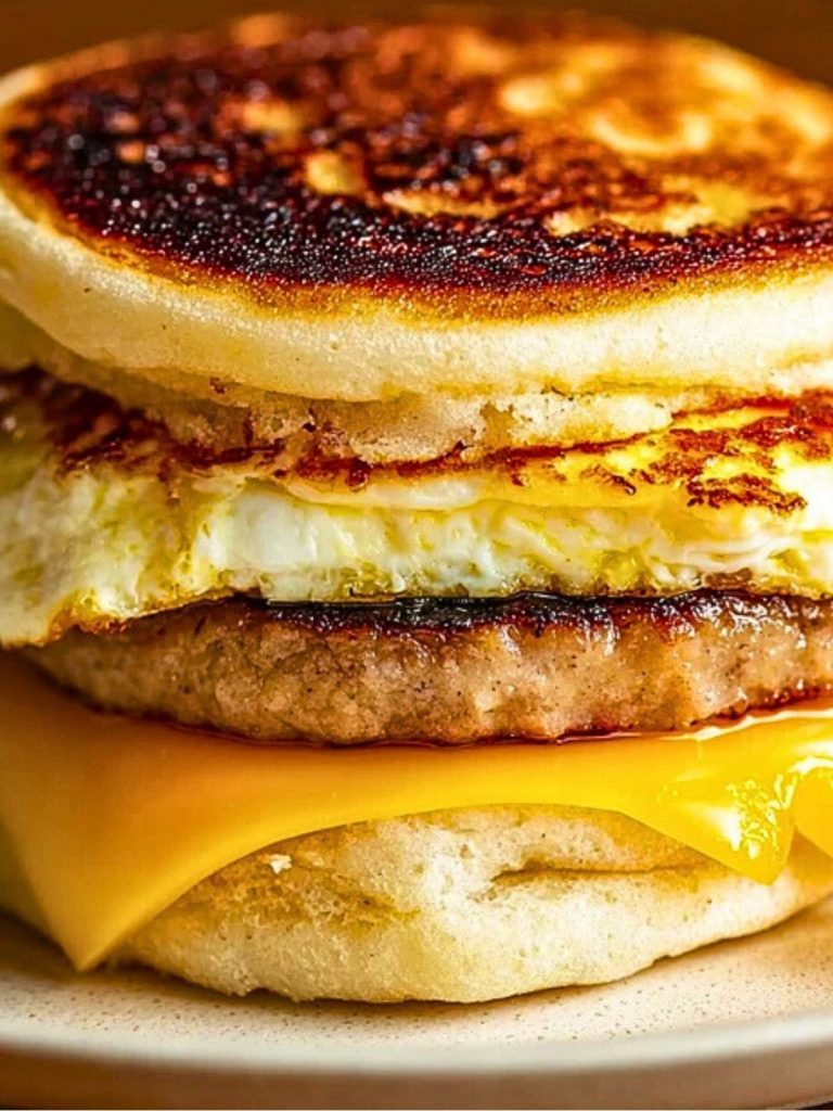 Picture this: a golden English muffin stacked with a sizzling sausage patty, a fried egg with lacy edges, melted cheddar cheese, and a drizzle of maple syrup that ties everything together. It’s fast-food inspired but made better—right from your kitchen.