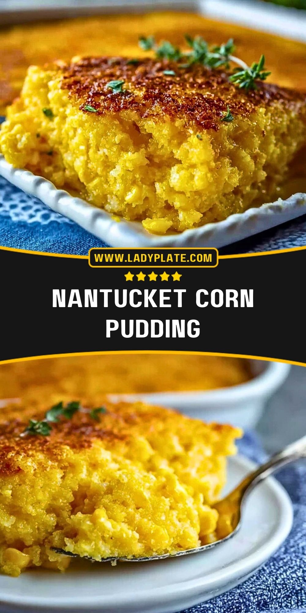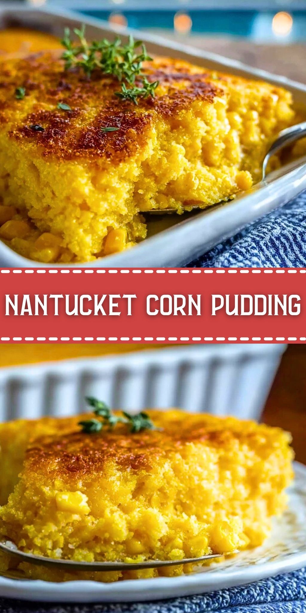Serve Nantucket Corn Pudding warm, straight from the oven, ideally as a side to roasted meats or alongside a holiday spread. The soft interior pairs beautifully with crispy textures like roasted chicken skin or seared pork chops.