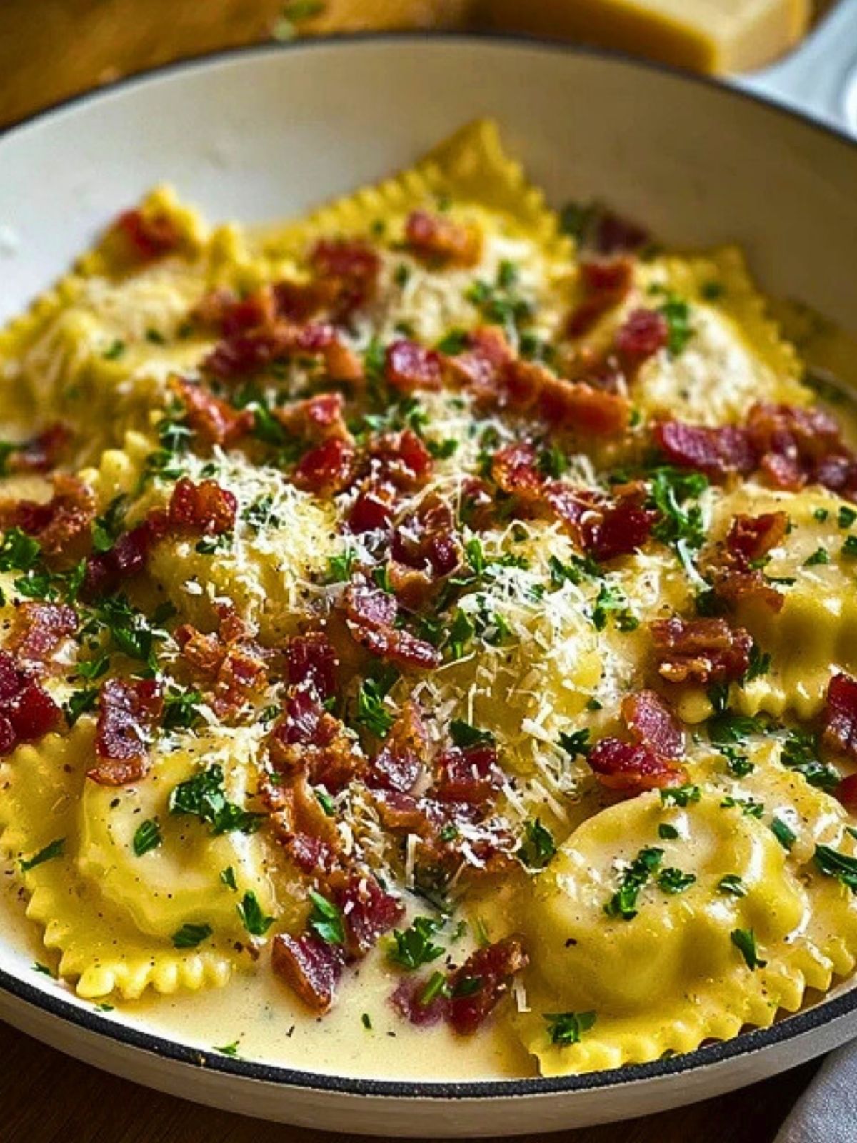 Serve this dish hot off the stove, while the sauce is creamy and clings beautifully to the ravioli. It’s best plated in shallow bowls with a generous spoonful of bacon and herbs on top. Pair it with a light green salad or roasted veggies if you’re balancing richness.