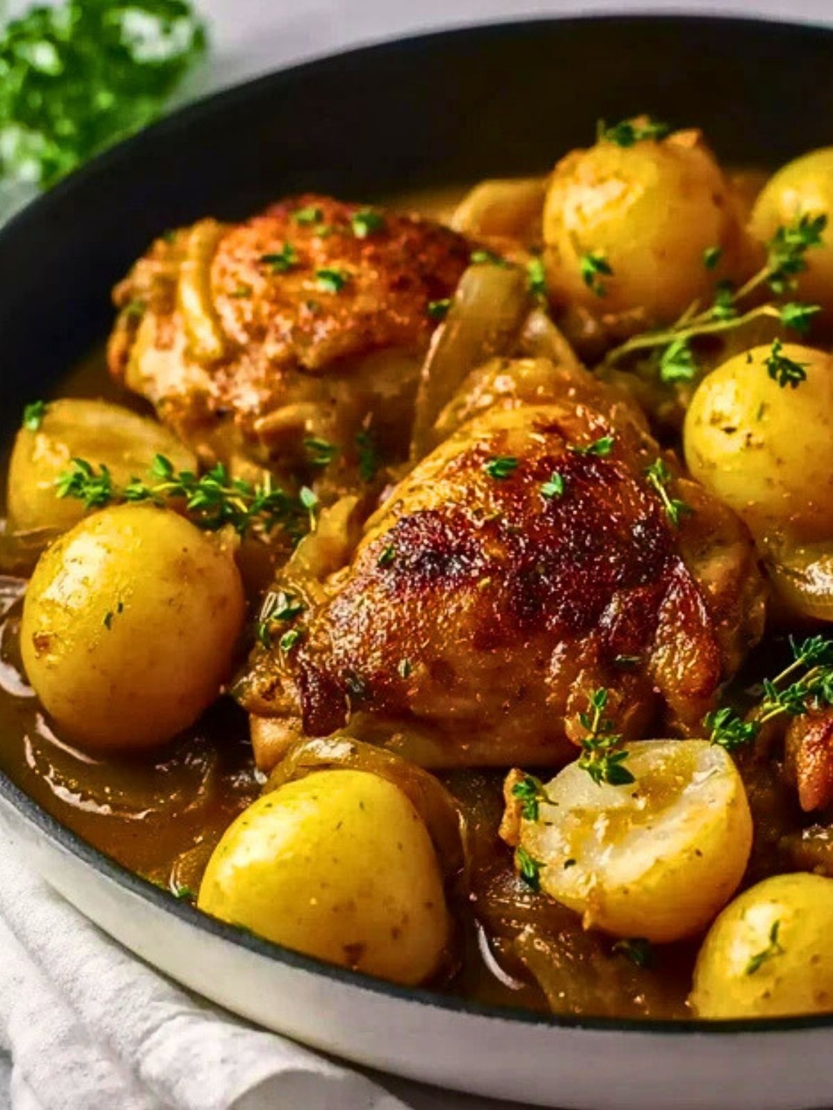 Let the dish rest for a few minutes out of the oven, then plate the chicken and potatoes with a generous ladle of that gorgeous gravy.