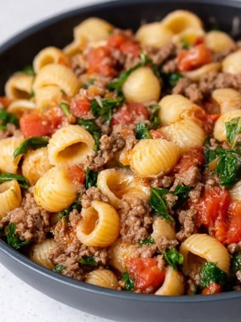 This One Pan Healthy Ground Beef Pasta is a wholesome, quick, and family-friendly dish. Made with lean ground beef, tender pasta, fresh spinach, and a savory tomato broth, it’s the perfect weeknight meal that balances nutrition with bold flavor—all in under 30 minutes and using just one skillet.