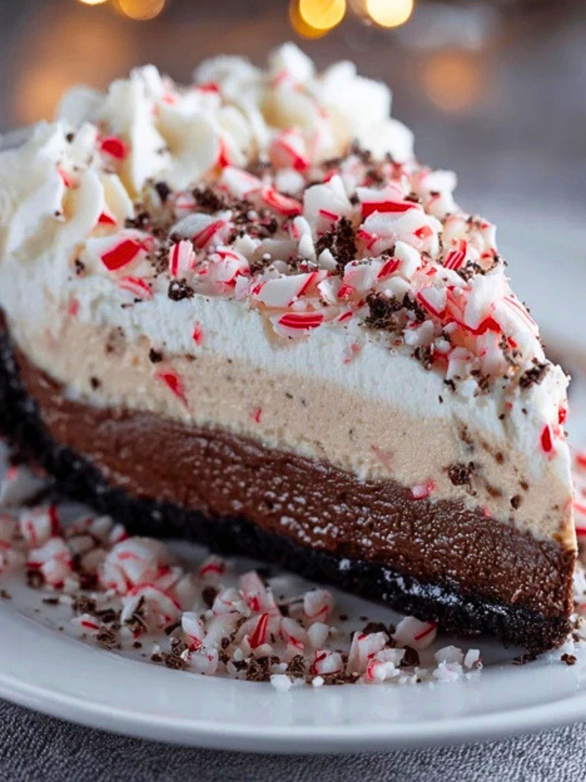 A chocolate cookie crust is the best match because it echoes the chocolate layer of peppermint bark. It also gives nice contrast to the creamy filling.